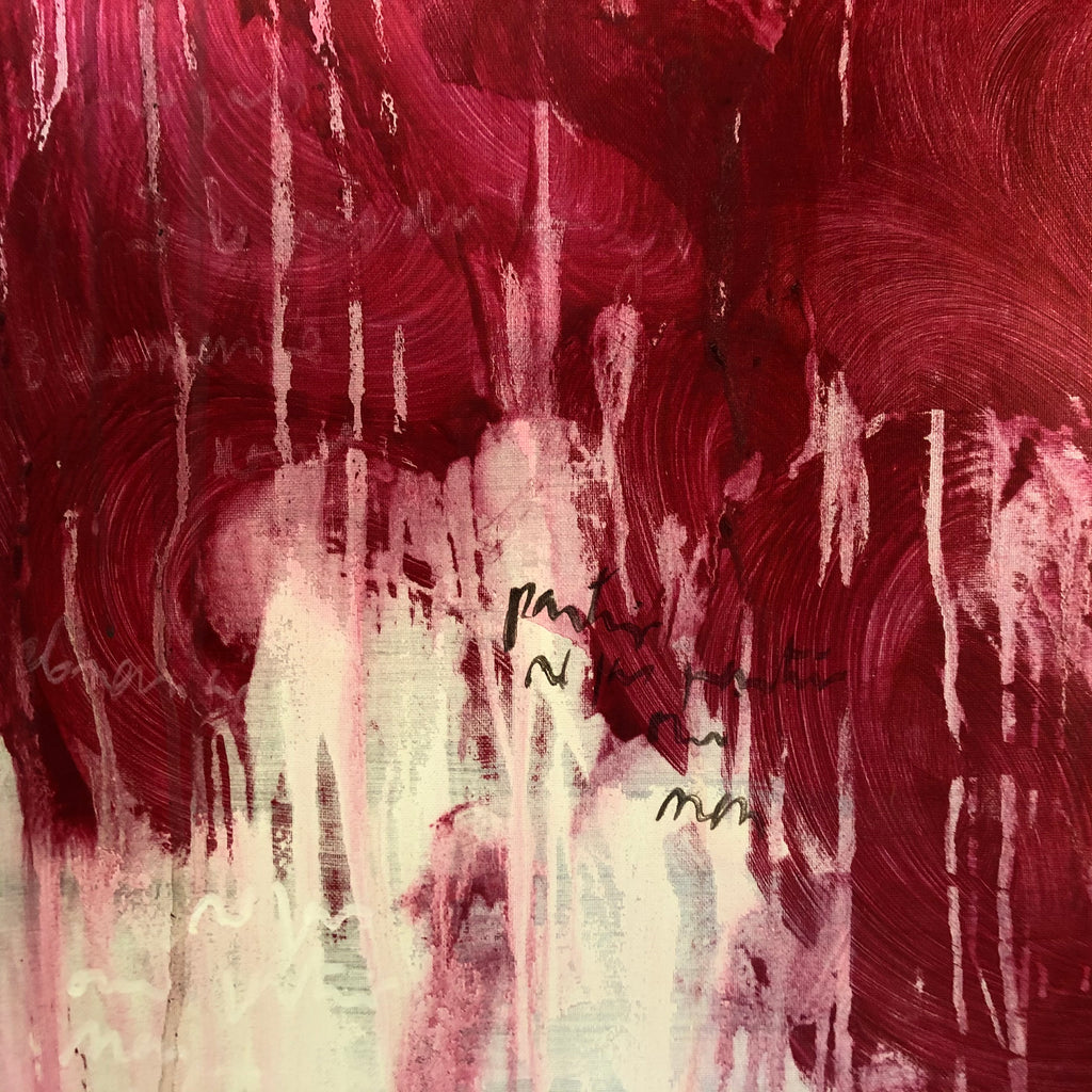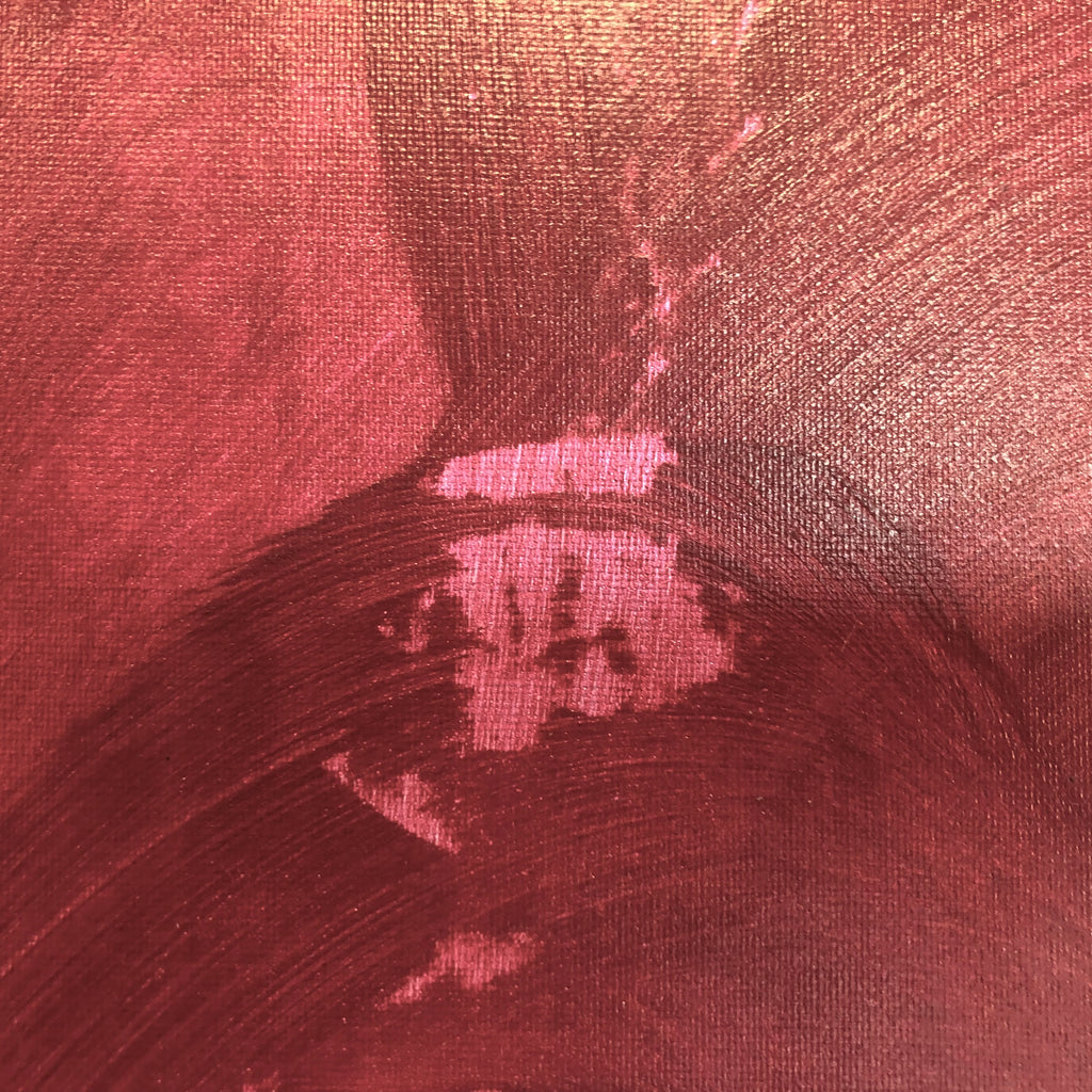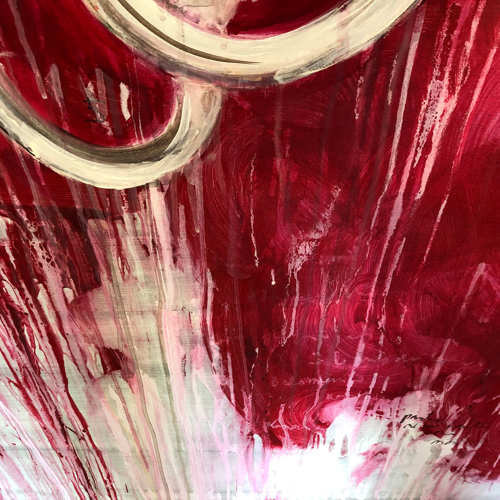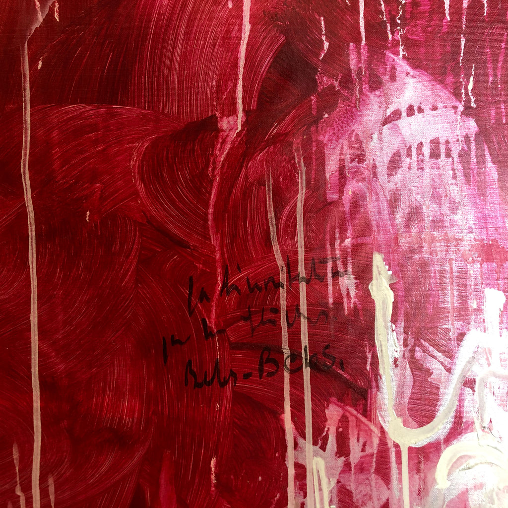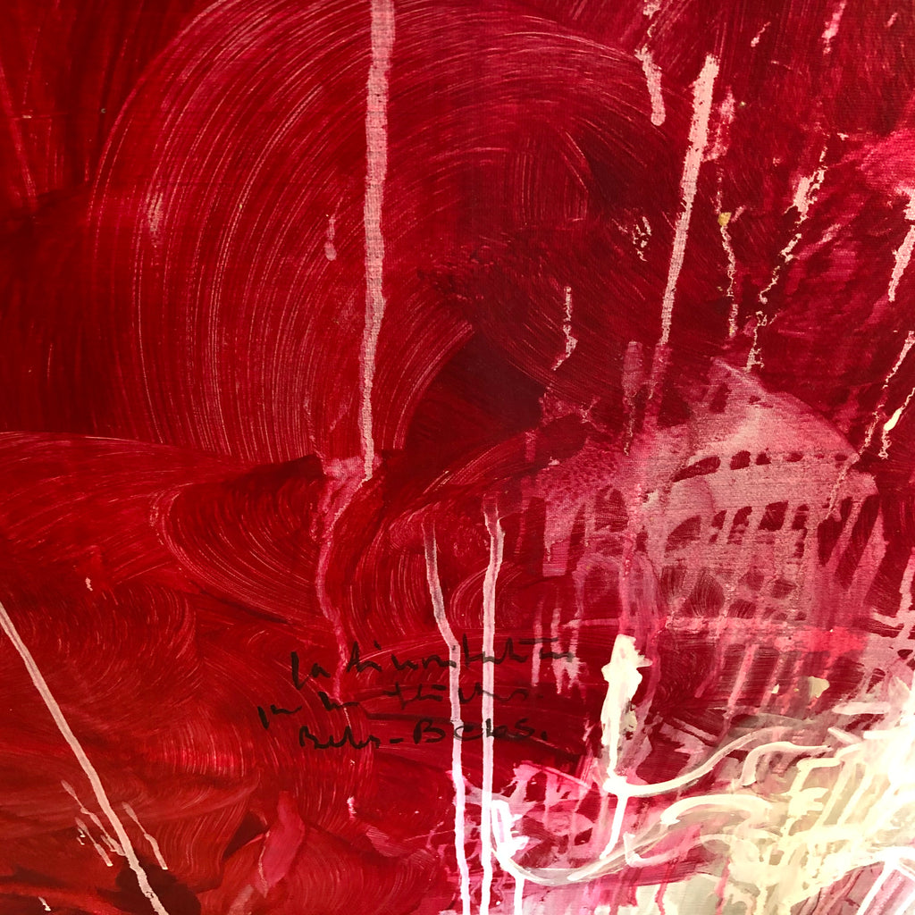 Mixed technique: Colored and red, silver pigments, glue, colored ink on canvas