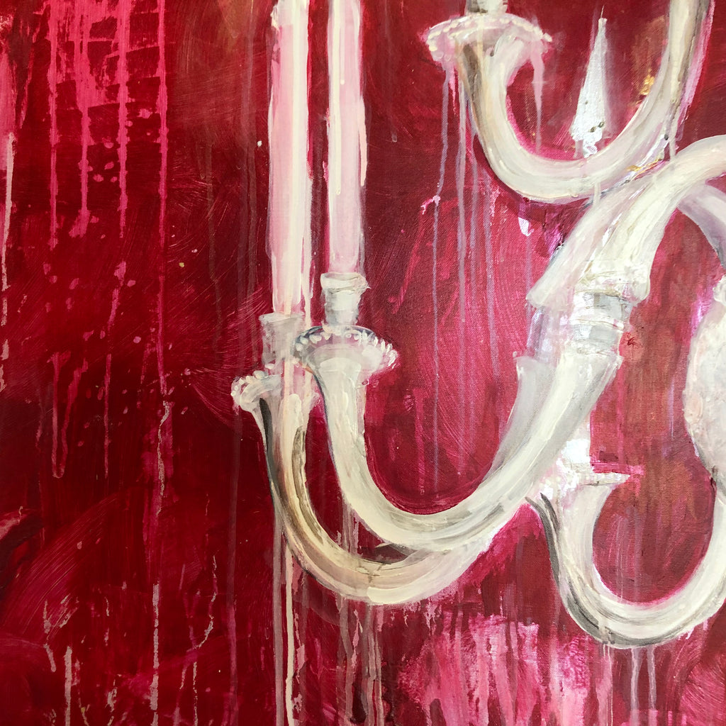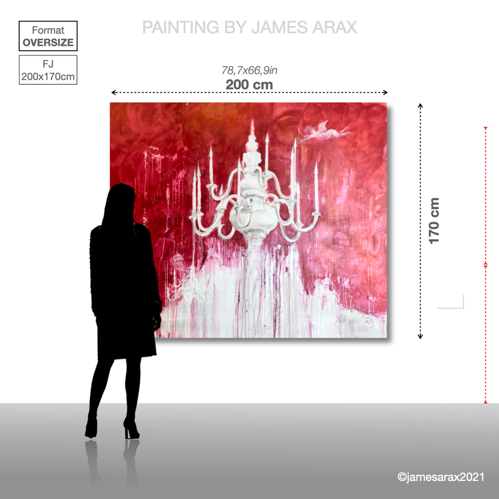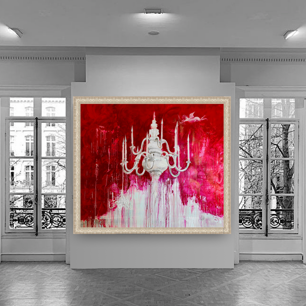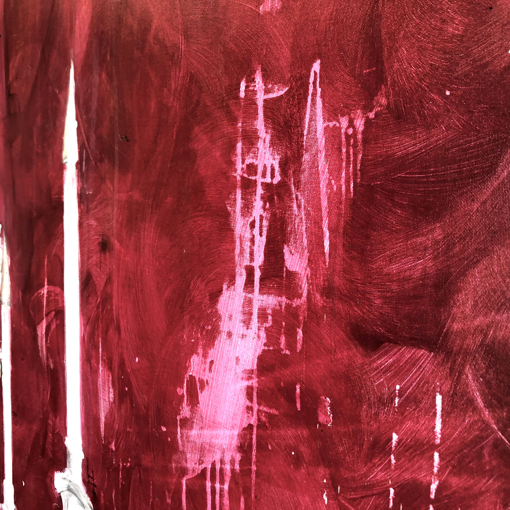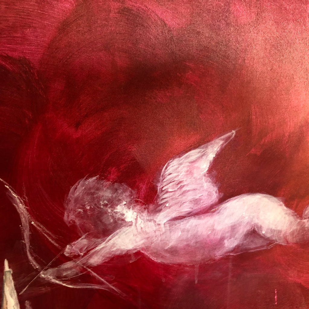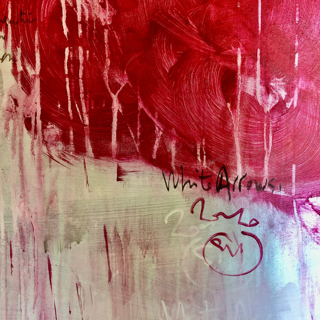 Mixed technique: Colored and red, silver pigments, glue, colored ink on canvas