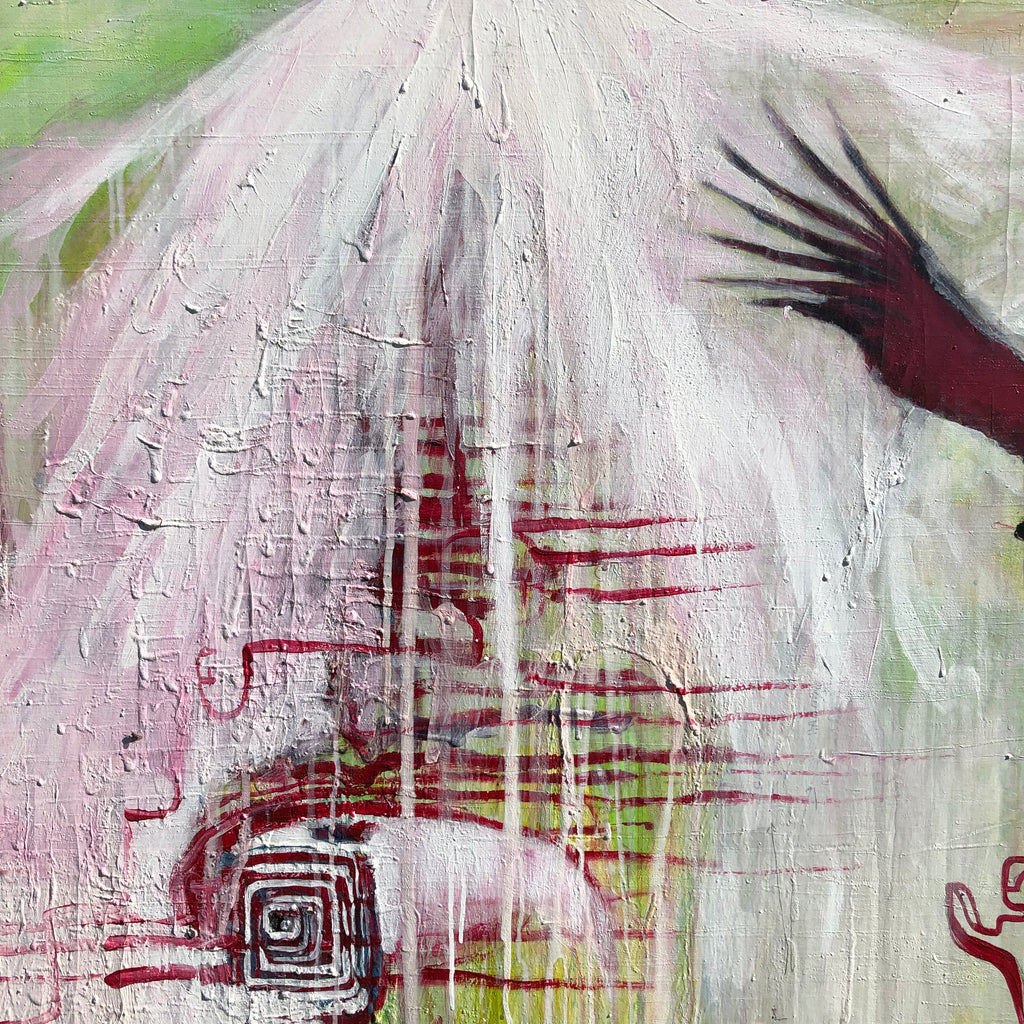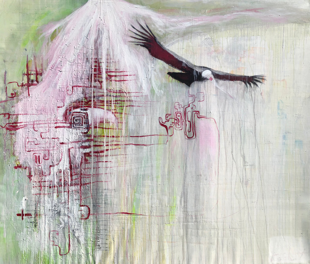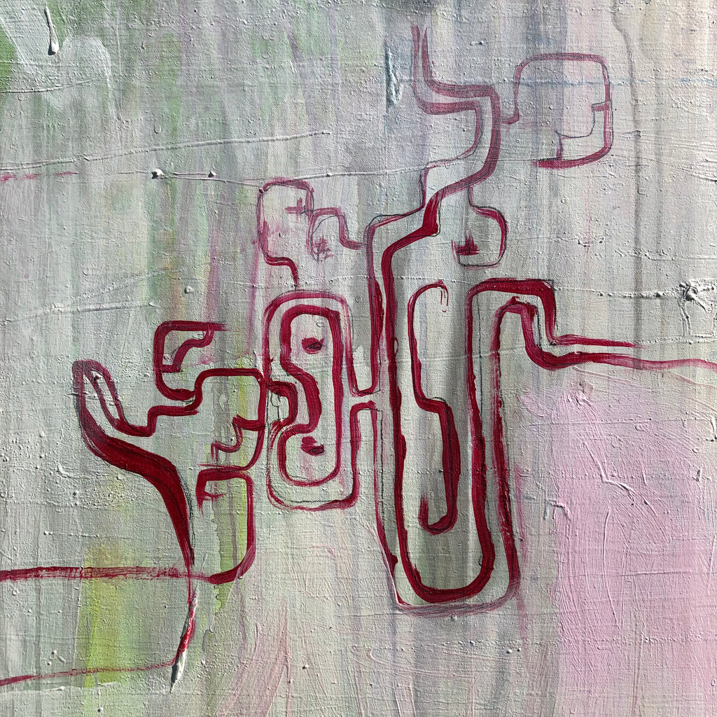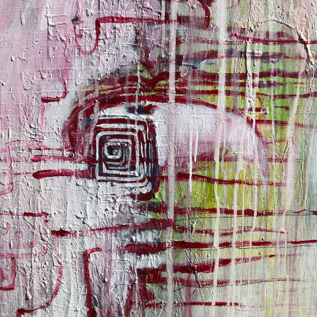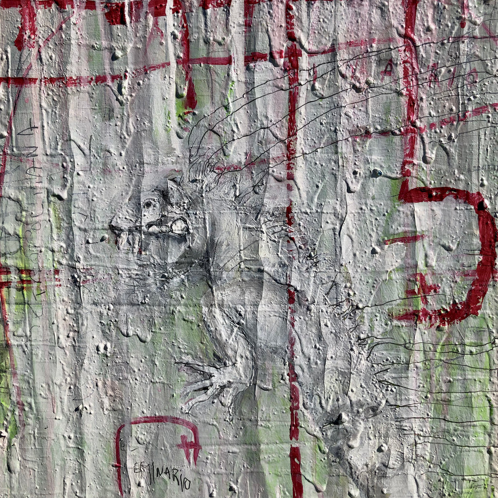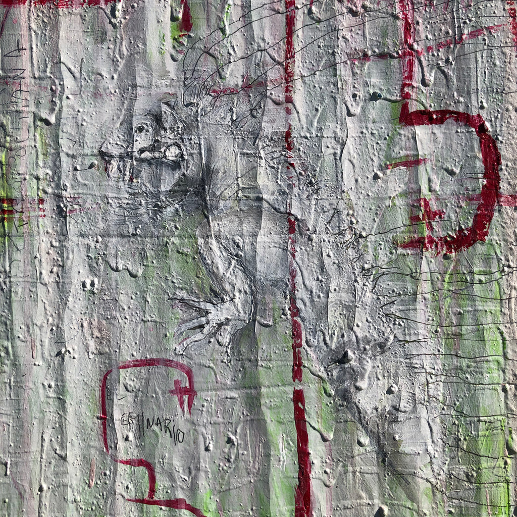 Mixed technique: Acrylic, colored pigments, lead pencil, glue, black ink on canvas