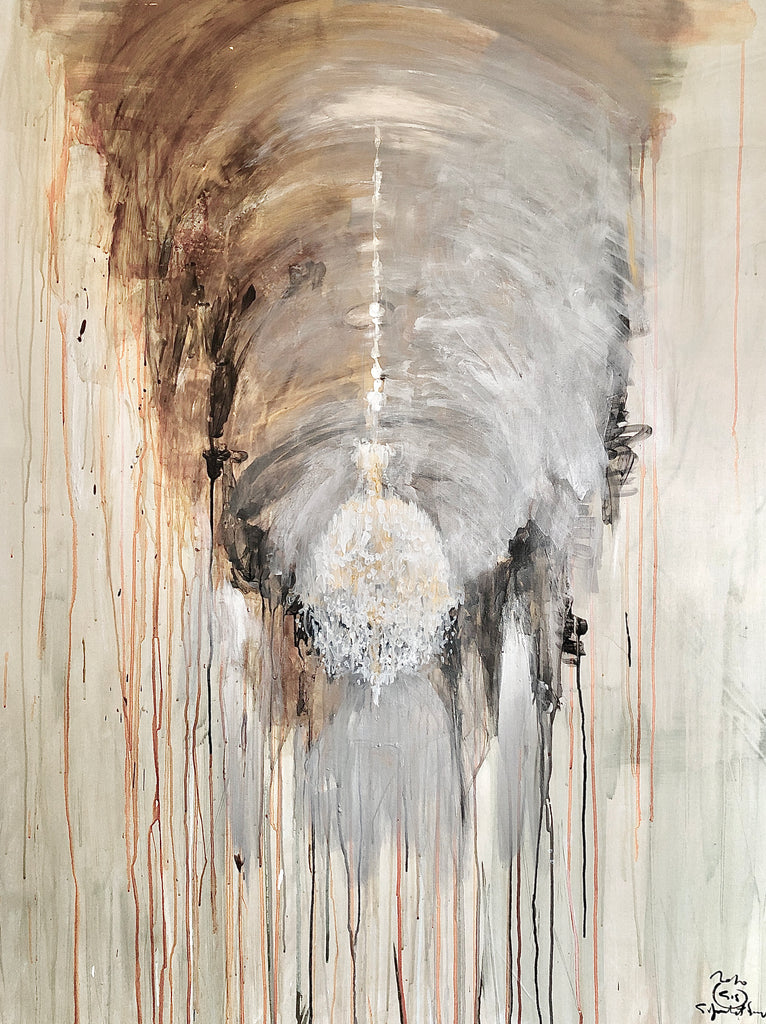 The chandelier seems to freeze the space of this immense volume, a cathedral, a church. the drips accentuate the feeling of levitation.