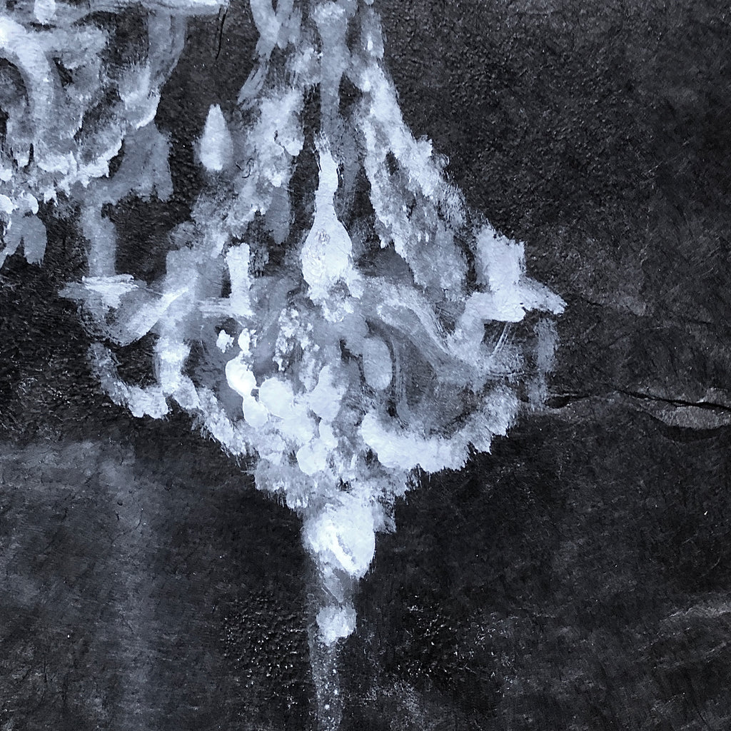 This stylized chandelier is made with white and liquid ink on black Lokta paper from Himalaya. James plays with his OpenFlow technique of flowing and drippings. He uses the variations of dark color of this vegetal paper made of Lokta, a tree from Nepal. This is an ancestral thick paper of great durability, resistant to tearing, moisture.