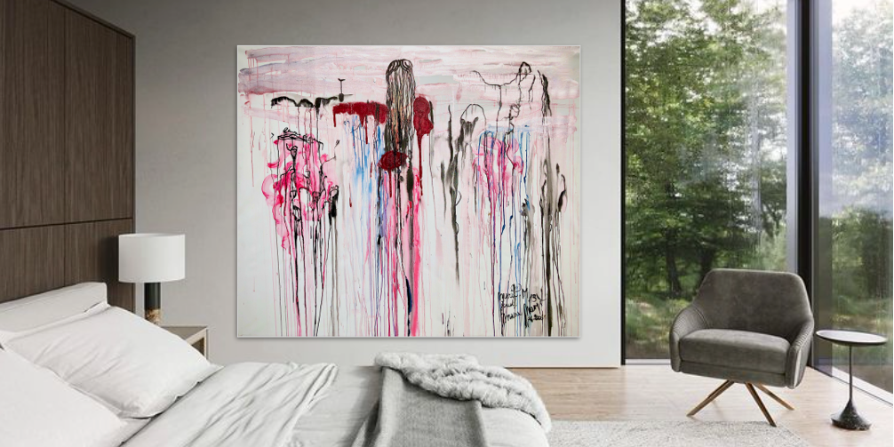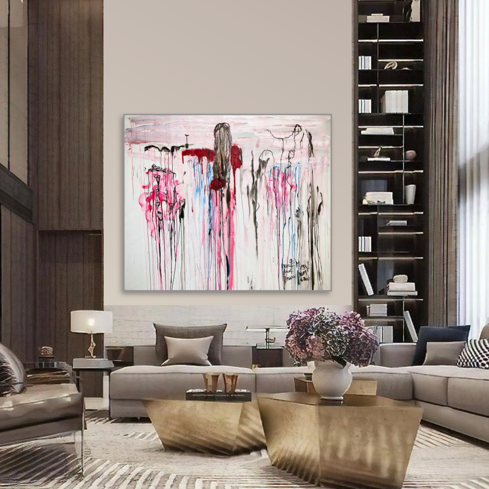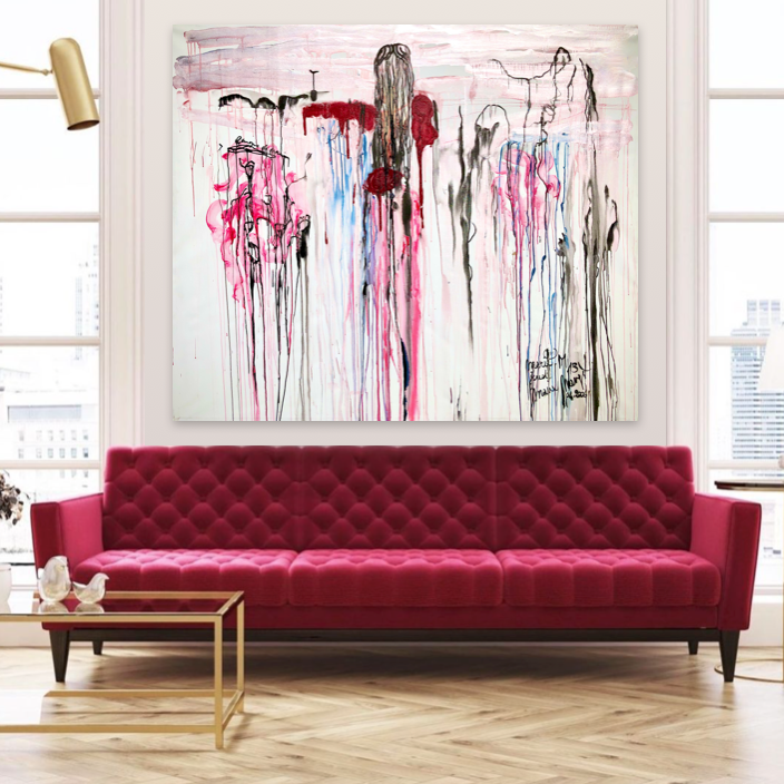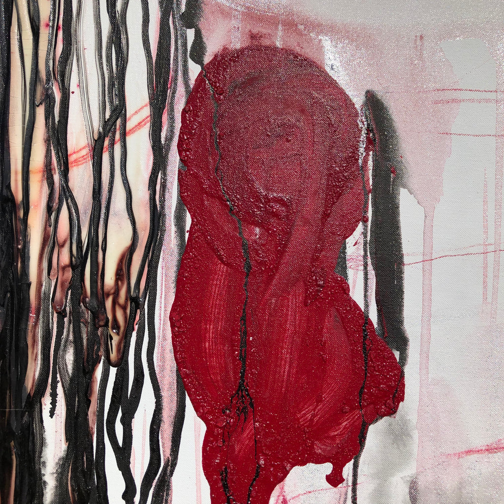 The long multicolored drips blend harmoniously into the background of the canvas in a fluid and continuous movement. The three flat red areas in the center are bold and vibrant, echoing the red color of the actress's clothes, they capture the attention and become the living heart of the work.