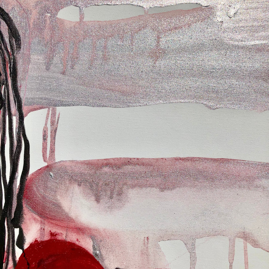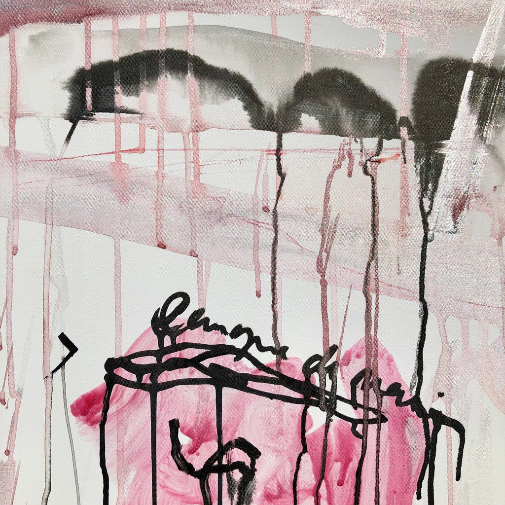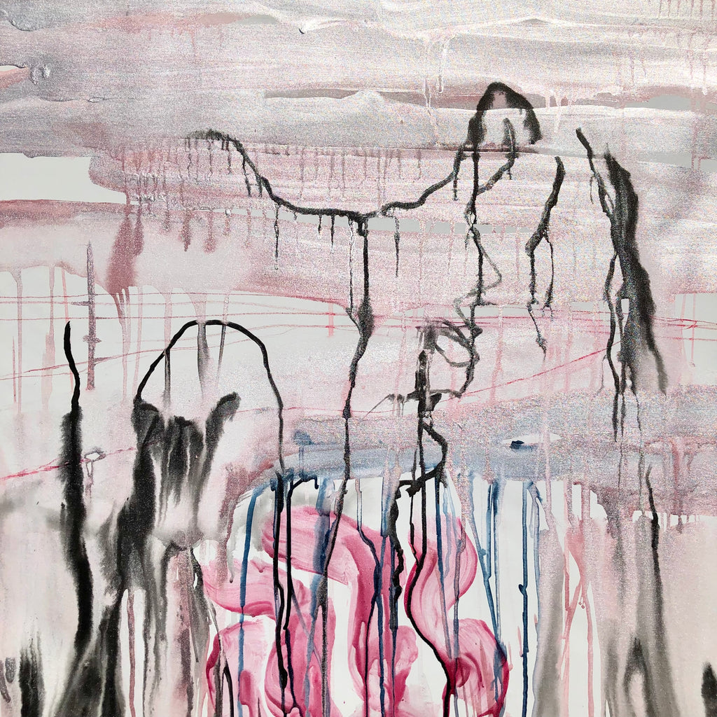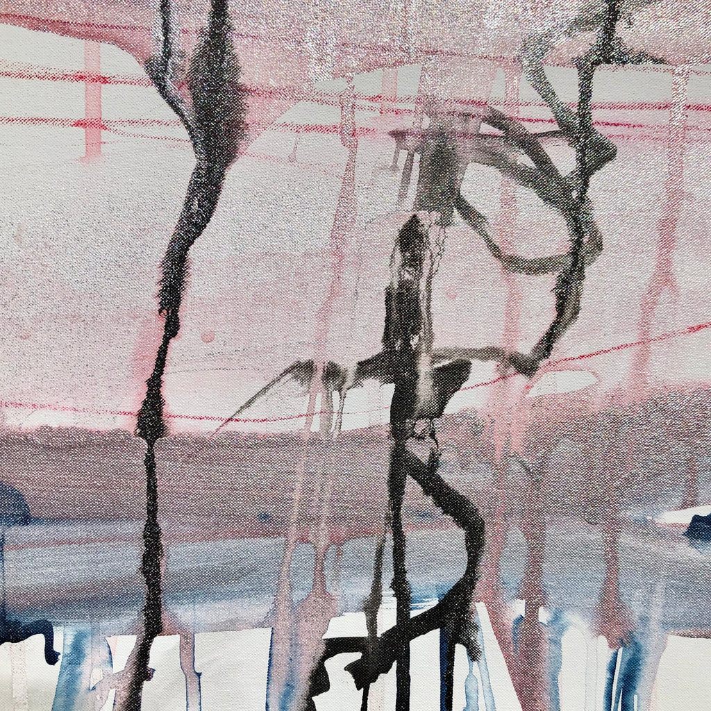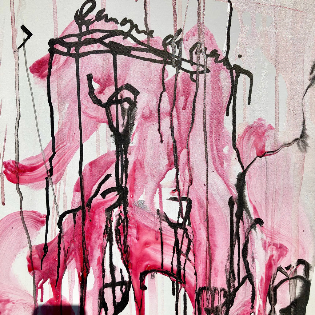 Mixed technique: Silver & pink pigments, colored inks, black ink on canvas