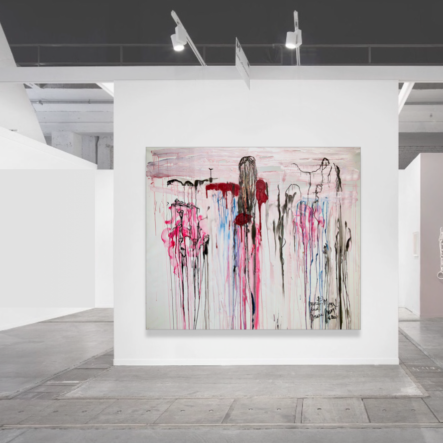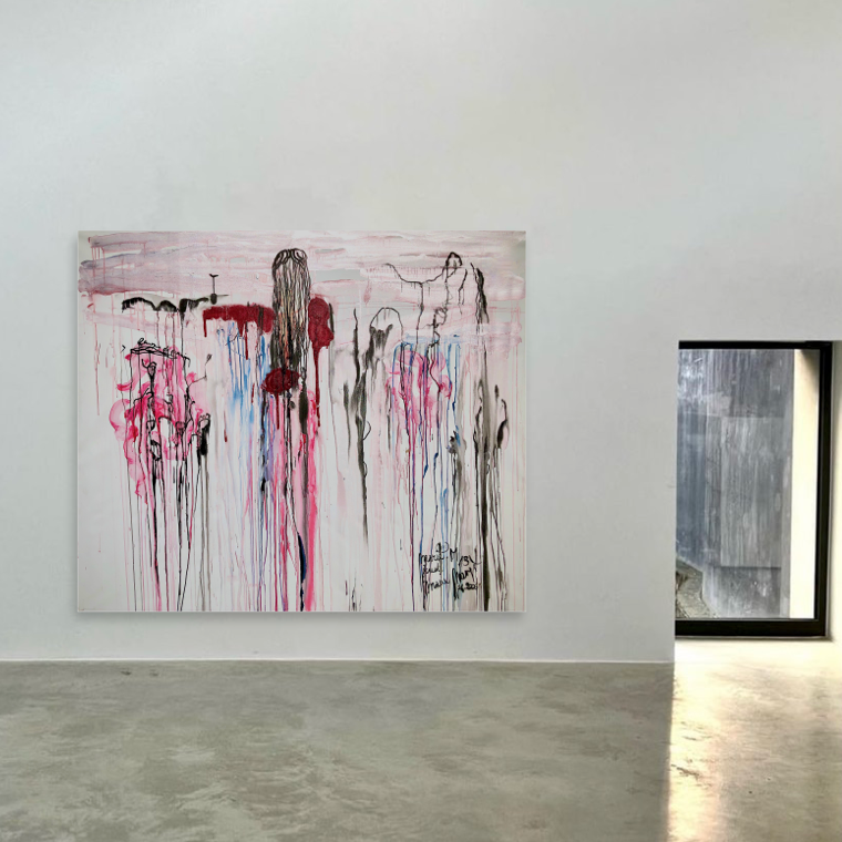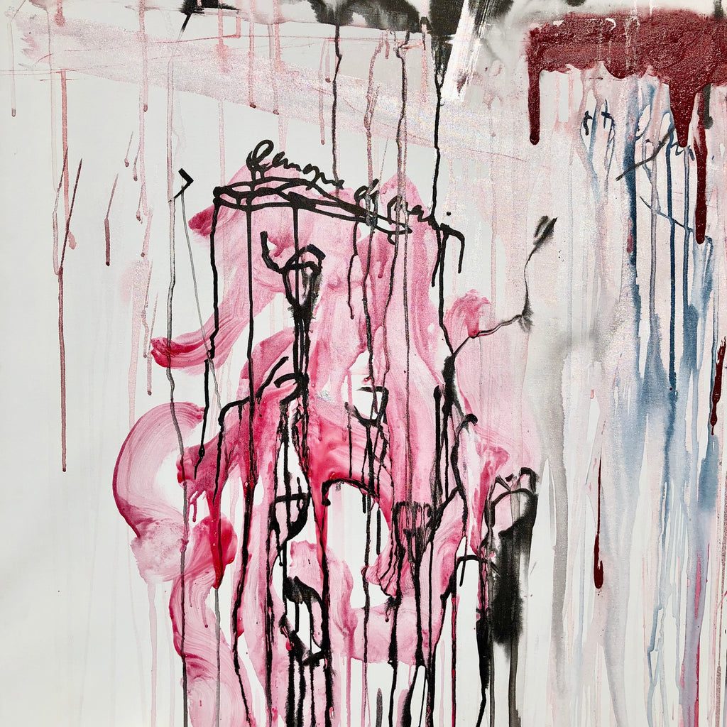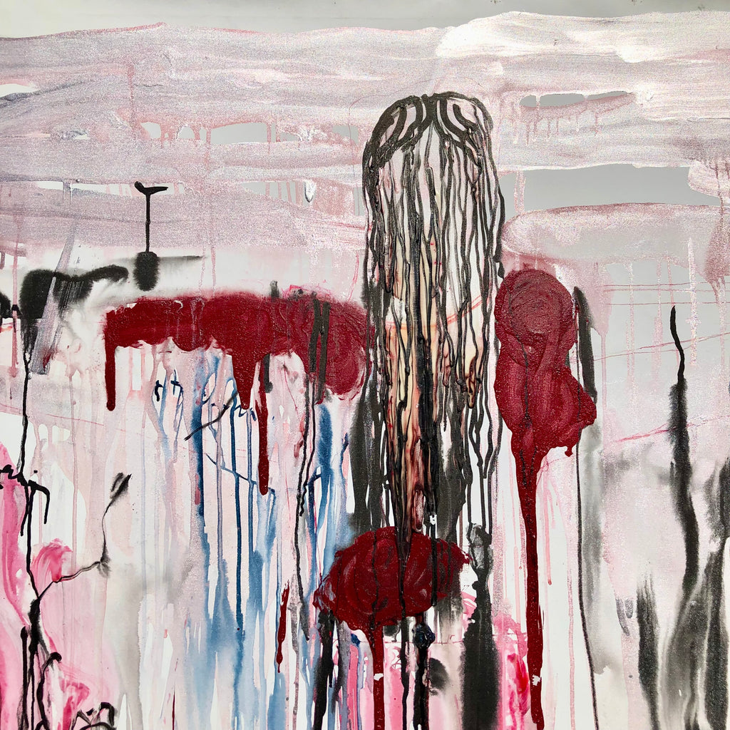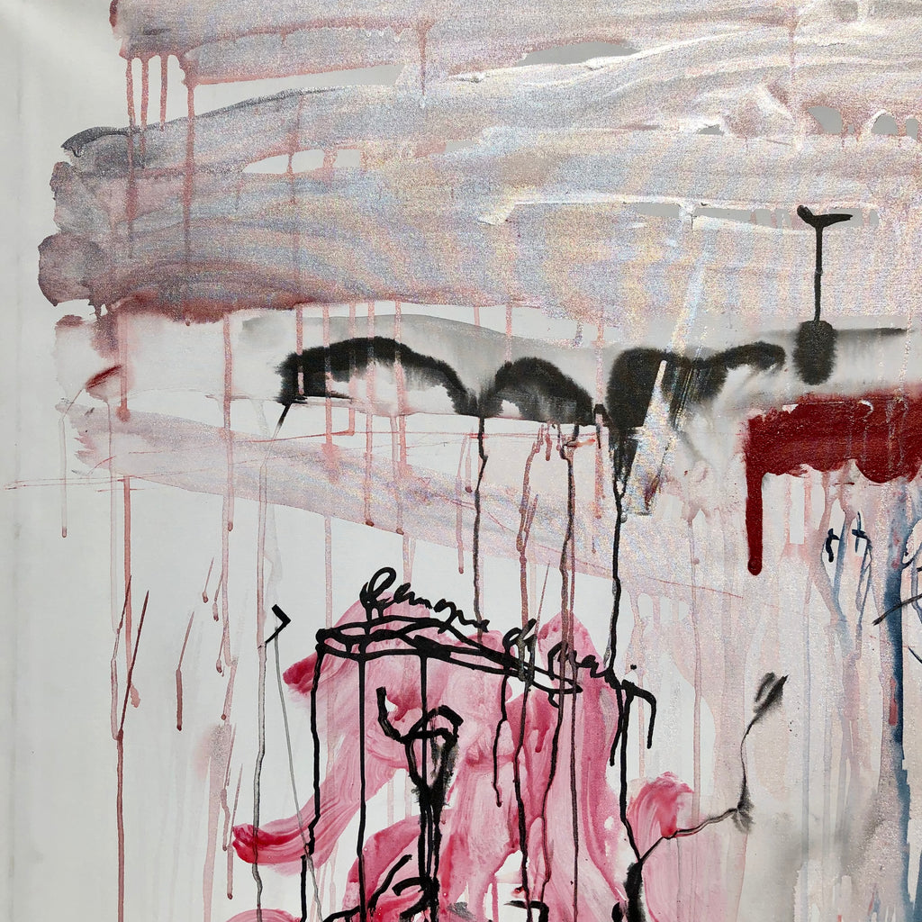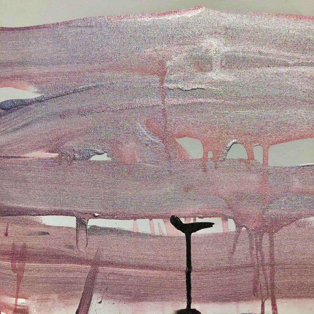 Mixed technique: Silver & pink pigments, colored inks, black ink on canvas