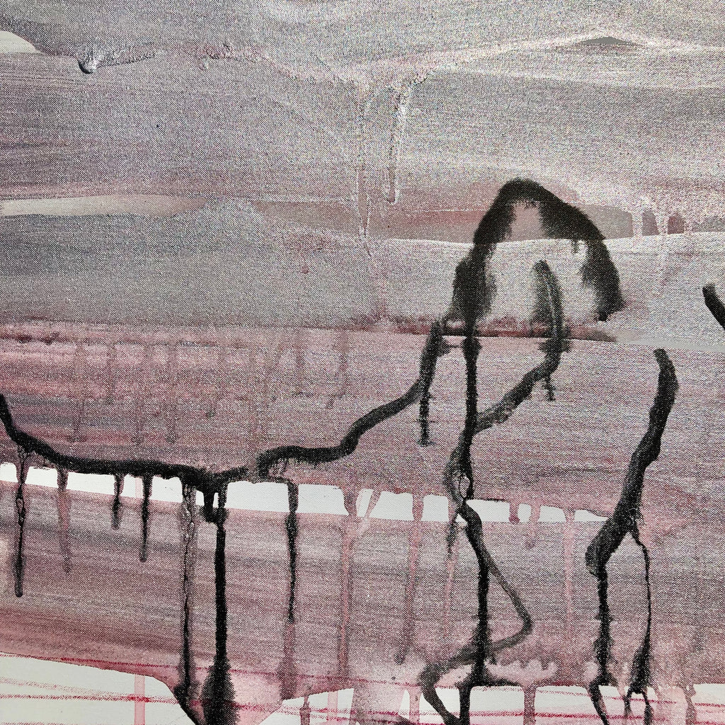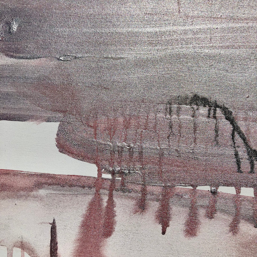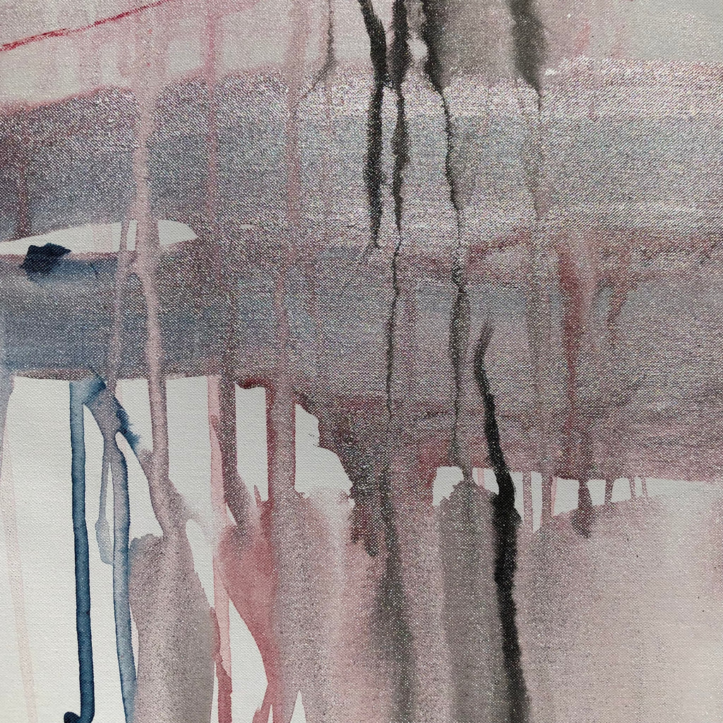 The bold use of silver and pink pigments fused at the top of the canvas offers an almost celestial dimension, a calming horizon contrasting with the organic colors that flow towards the bottom of the canvas. The whole creates a fascinating and lyrical visual dynamic.