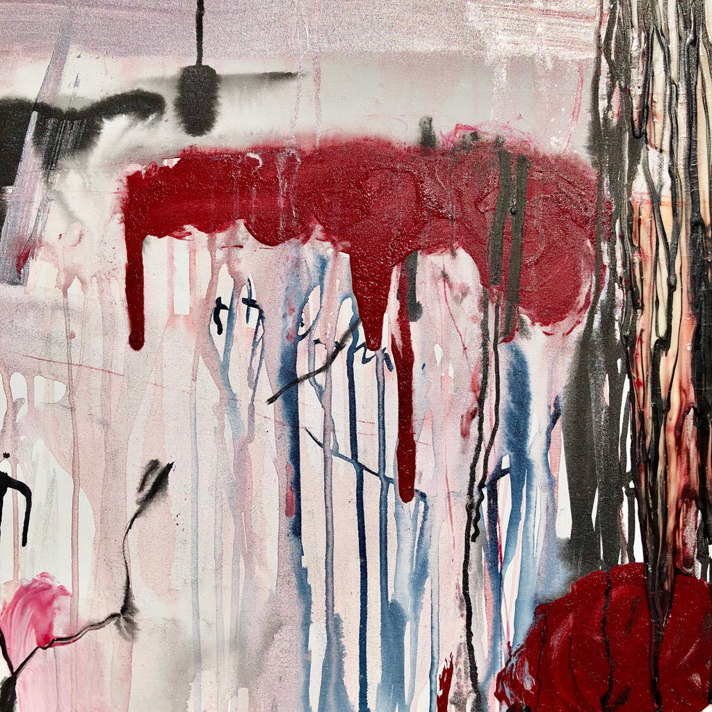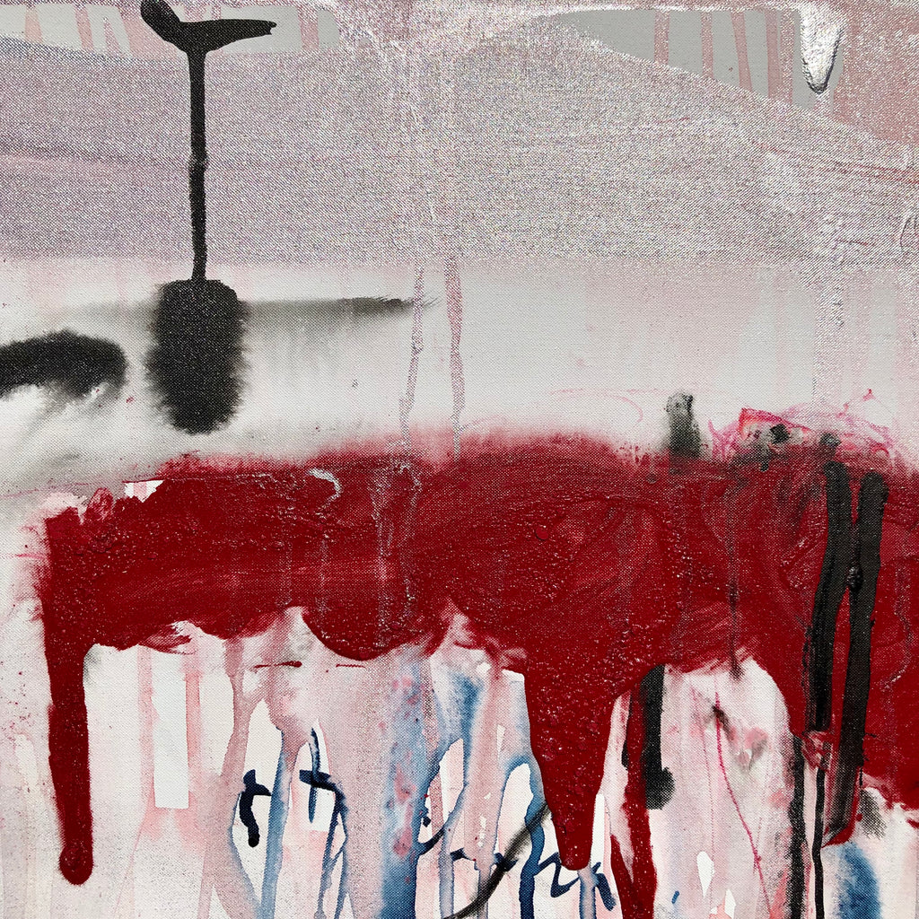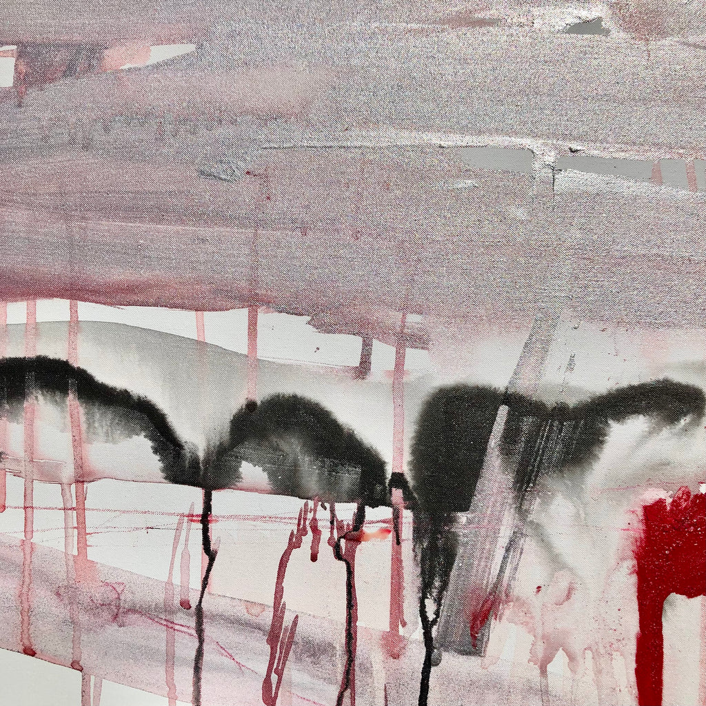 The bold use of silver and pink pigments fused at the top of the canvas offers an almost celestial dimension, a calming horizon contrasting with the organic colors that flow towards the bottom of the canvas. The whole creates a fascinating and lyrical visual dynamic.