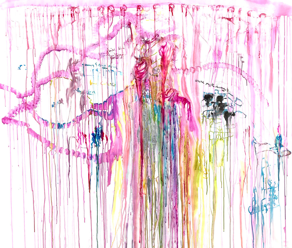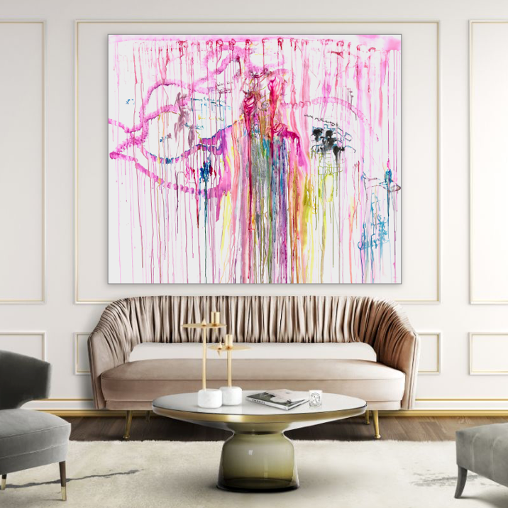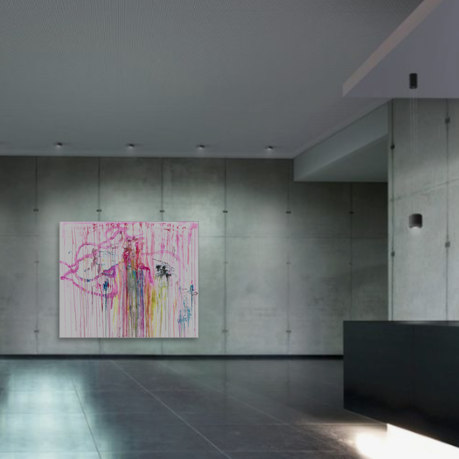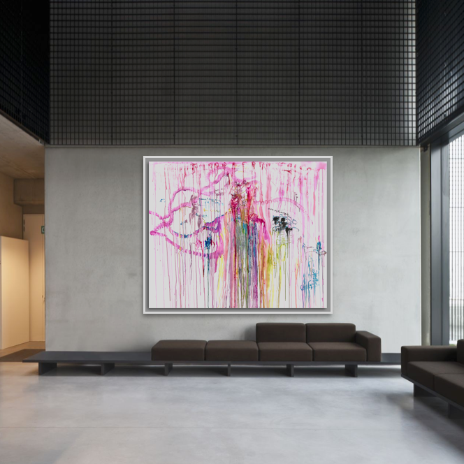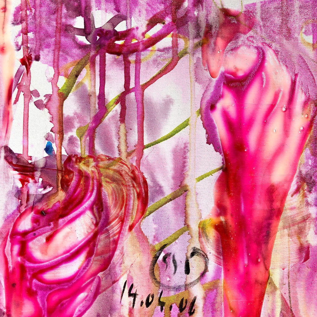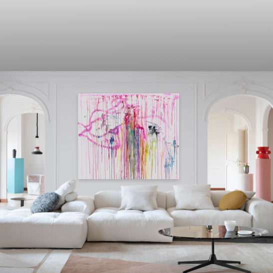 This specific piece stands out for its bold and expansive use of vivid colors that intertwine in a visual ballet on the canvas. The colors flow freely at the center, creating organic patterns that evoke a sensation of constant movement. The string of pink blotches recalls the boa worn by the model during the session. The dominant pink, a symbol of delicacy and passion, contrasts harmoniously with touches of blue, yellow, tender green, and black, illustrating the complexity and richness of the attire of "the Parisian socialite”.