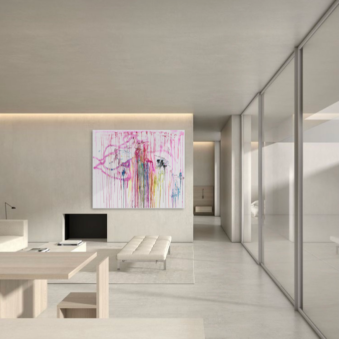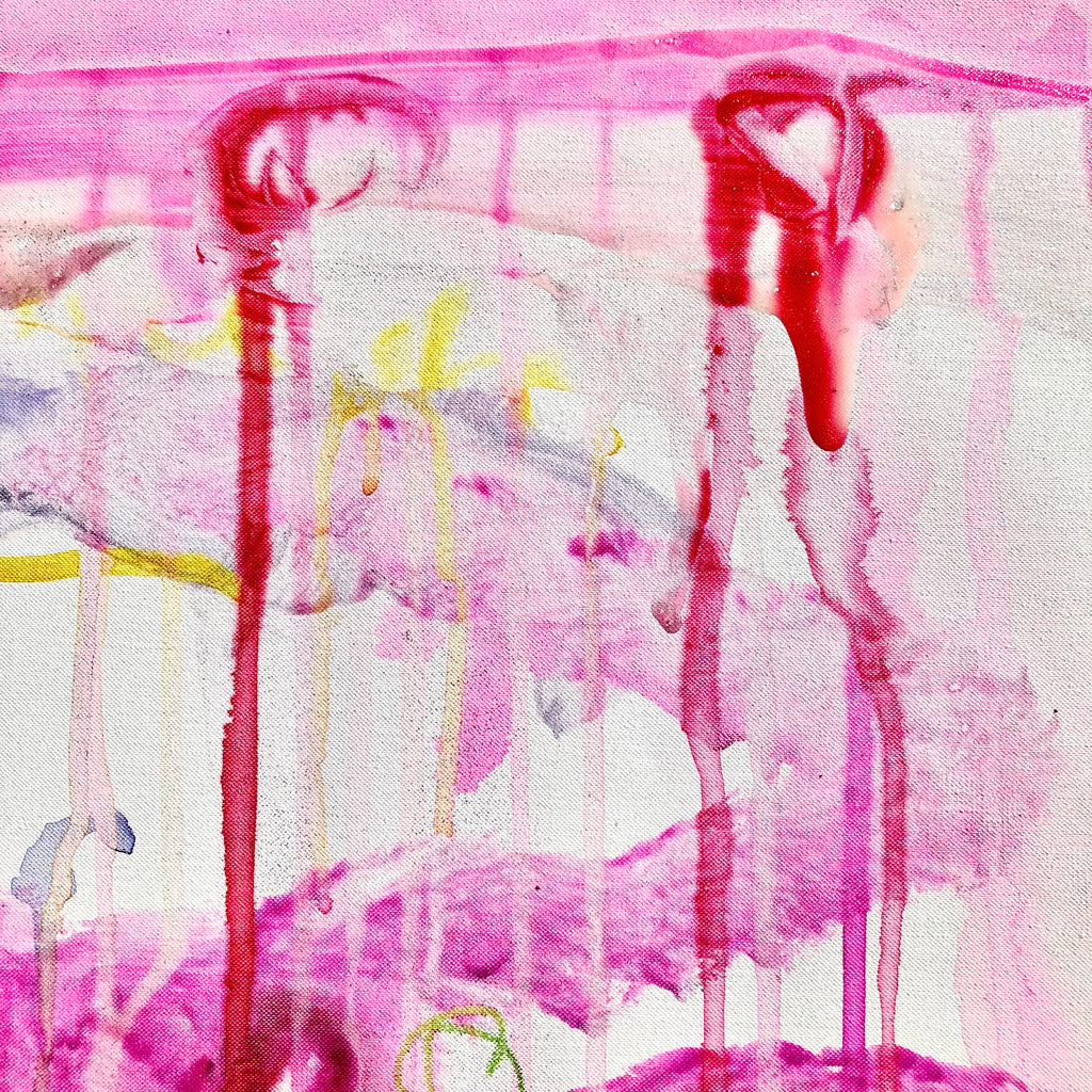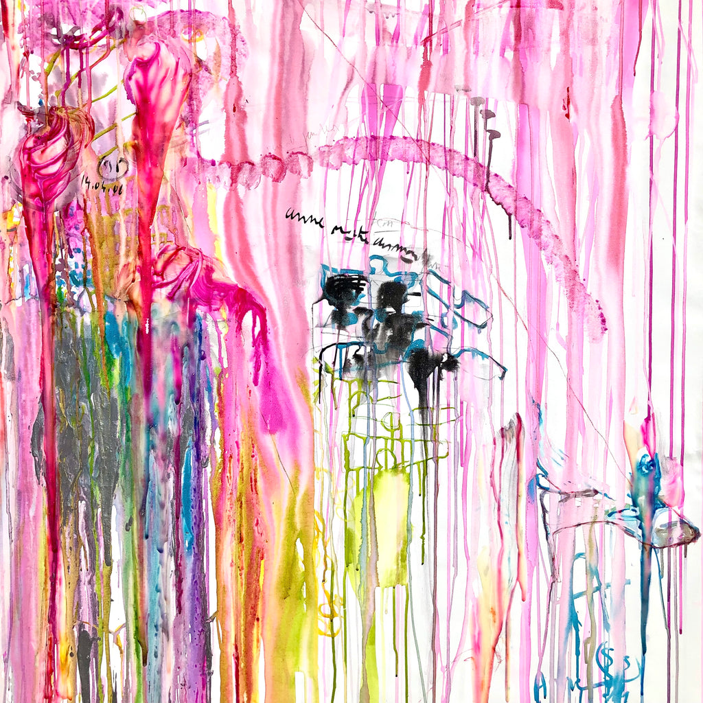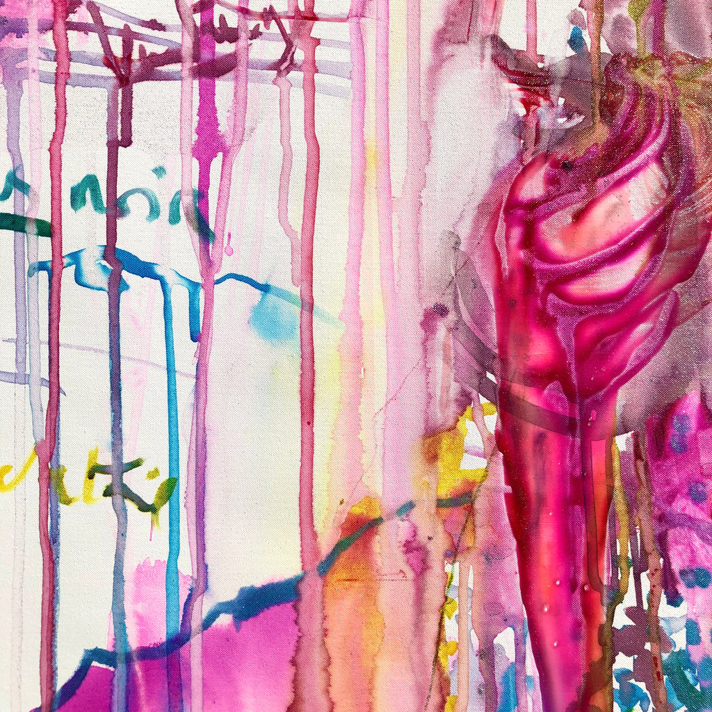 This specific piece stands out for its bold and expansive use of vivid colors that intertwine in a visual ballet on the canvas. The colors flow freely at the center, creating organic patterns that evoke a sensation of constant movement. The string of pink blotches recalls the boa worn by the model during the session. The dominant pink, a symbol of delicacy and passion, contrasts harmoniously with touches of blue, yellow, tender green, and black, illustrating the complexity and richness of the attire of "the Parisian socialite”.