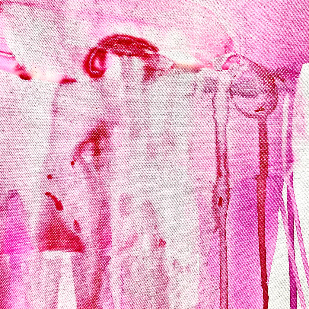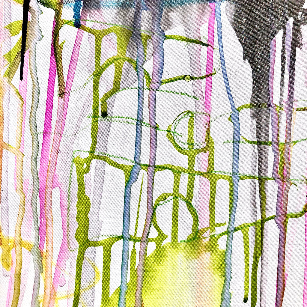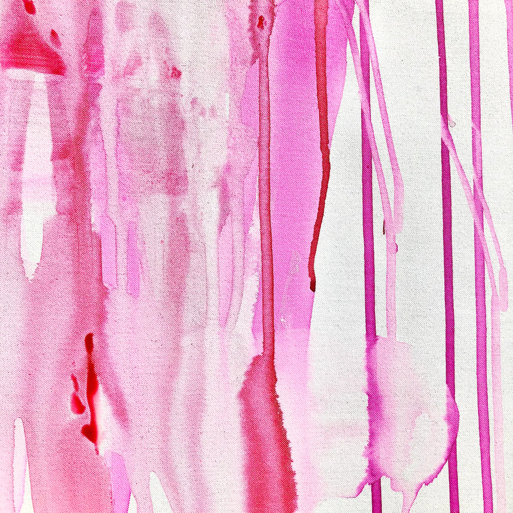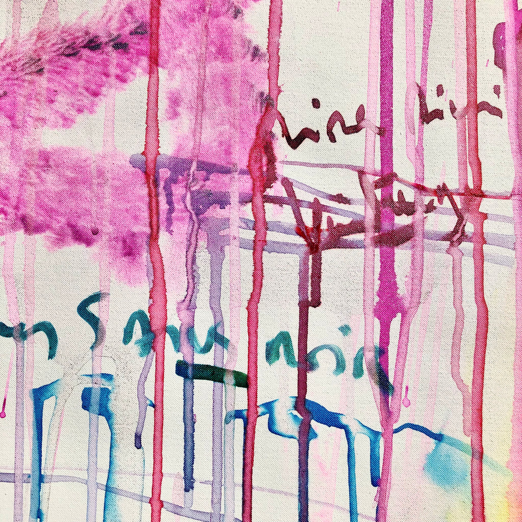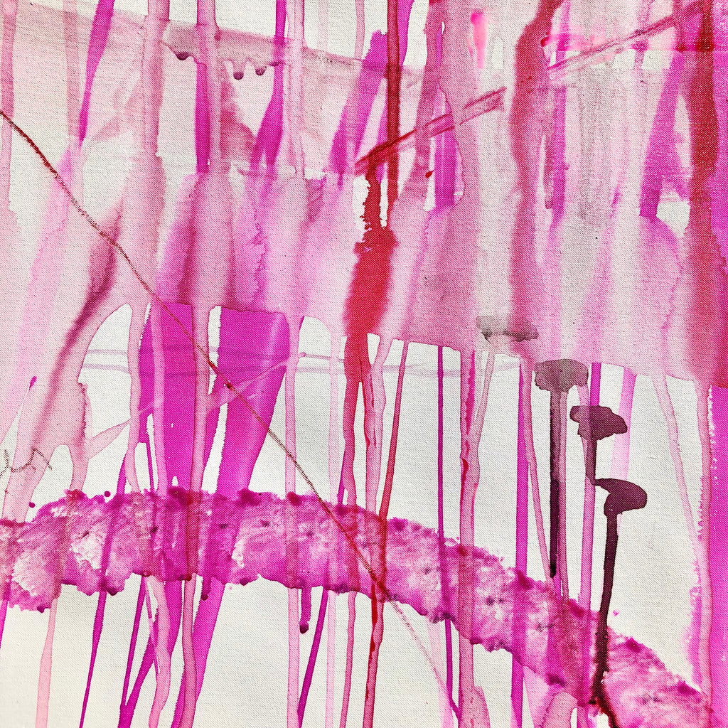 Mixed technique: Silver & pink pigments, colored inks, black ink on canvas