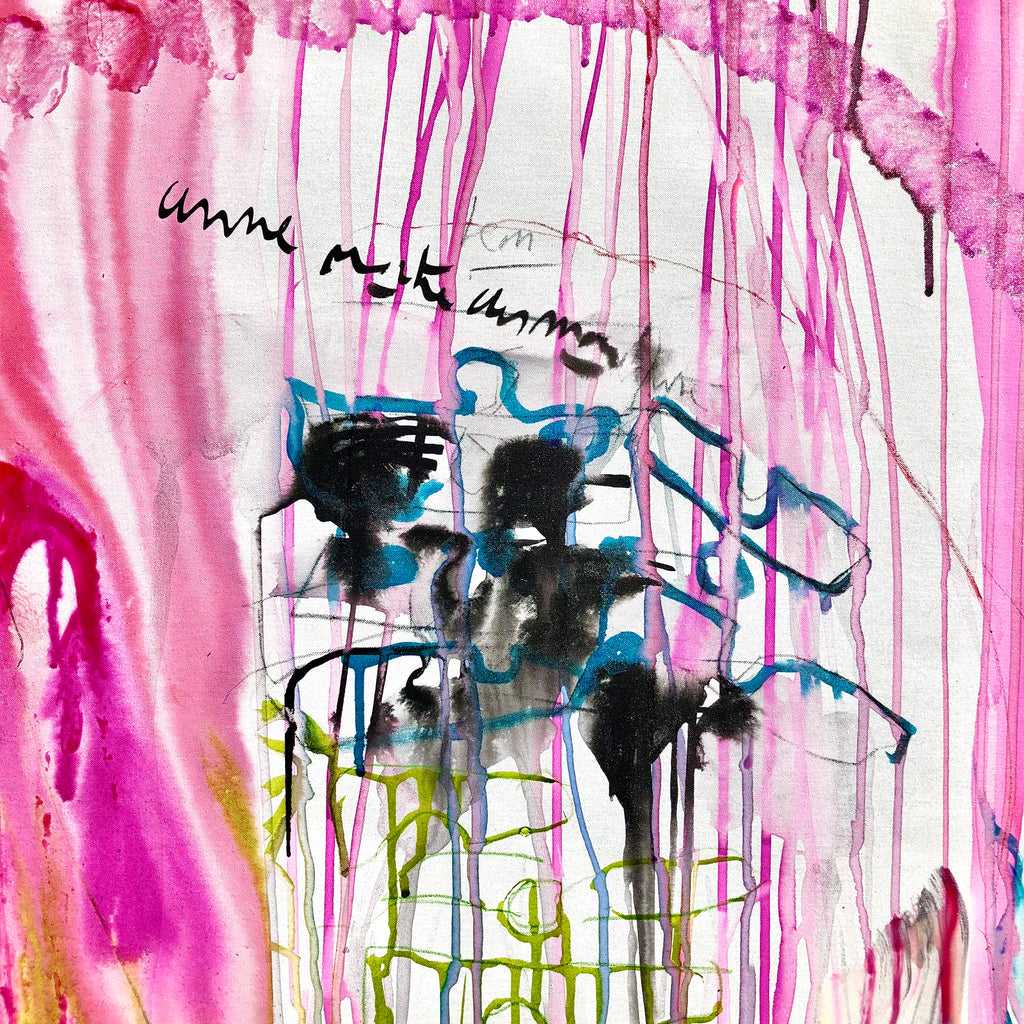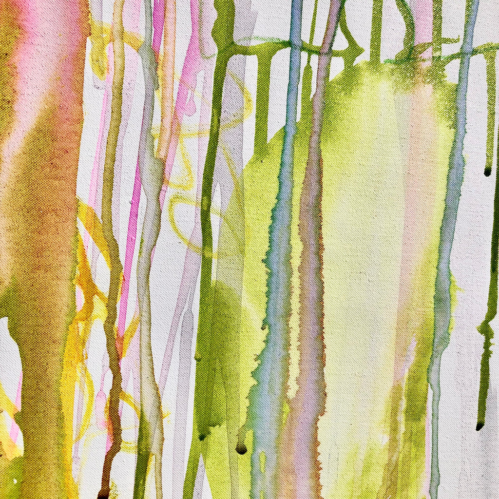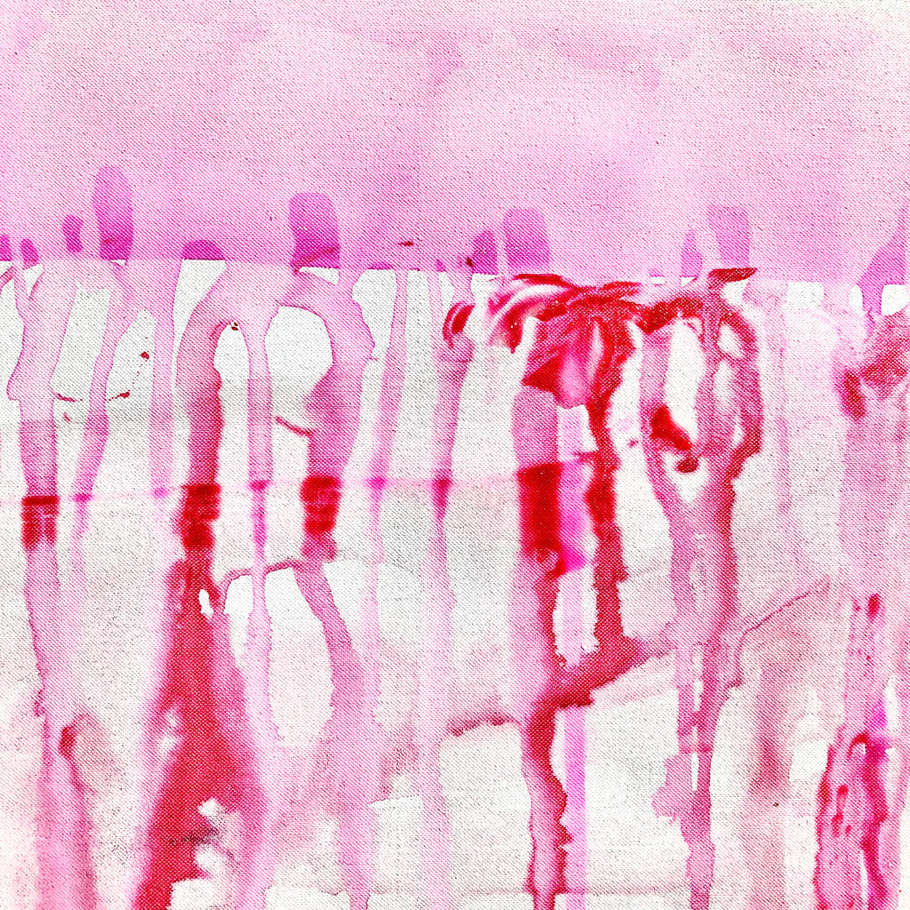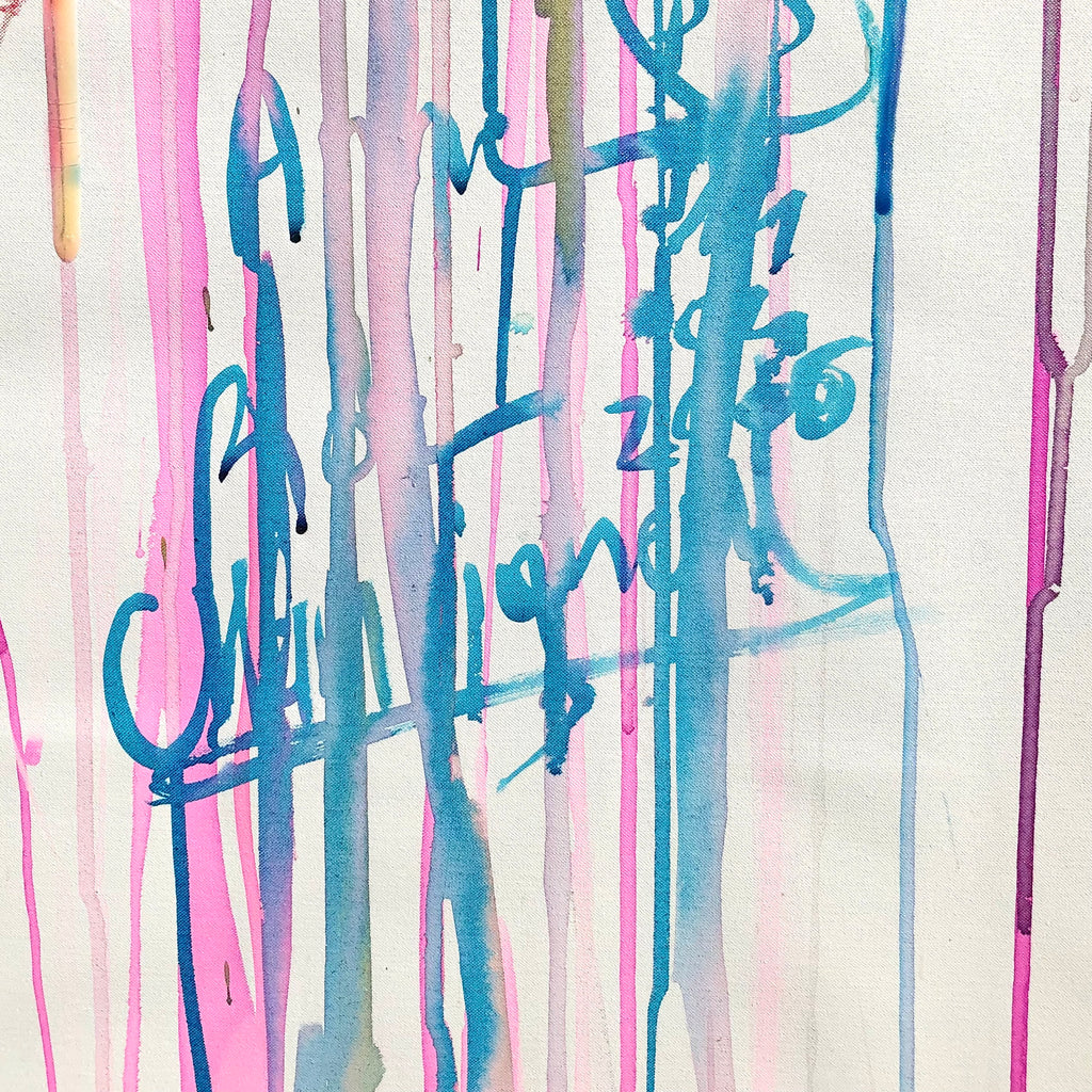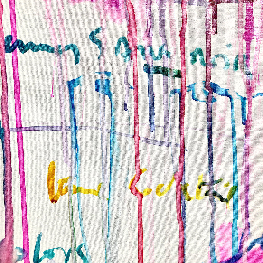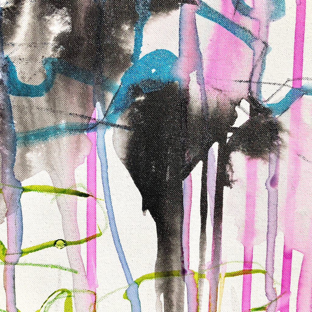 Mixed technique: Silver & pink pigments, colored inks, black ink on canvas