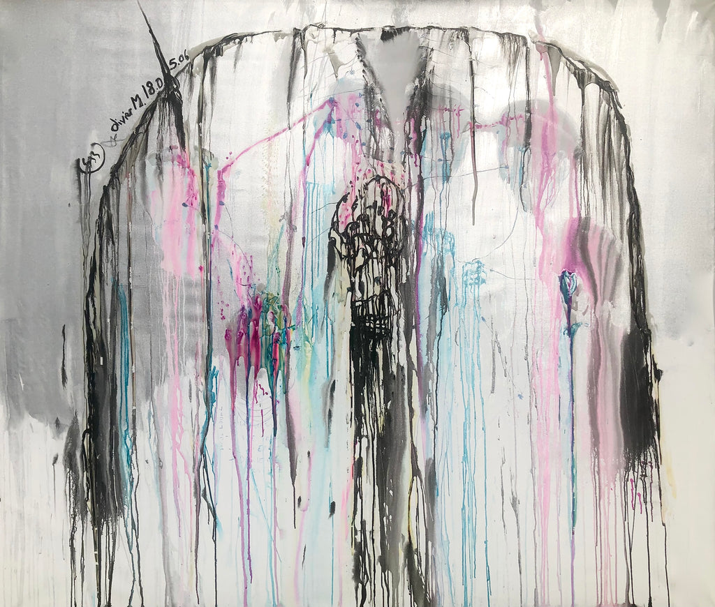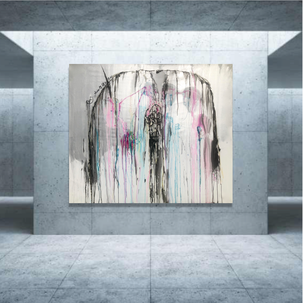 ... The model was a real estate agent, a very talented and elegant young man. Passionated by his job in the most beautiful places of Paris. Sometimes over exited, maybe the reason why James created in the middle of the painting a skull full of neurons. Higher up, the large black gesture from left to right defines the limit between the inside and the outside, like the thickness of a skull.