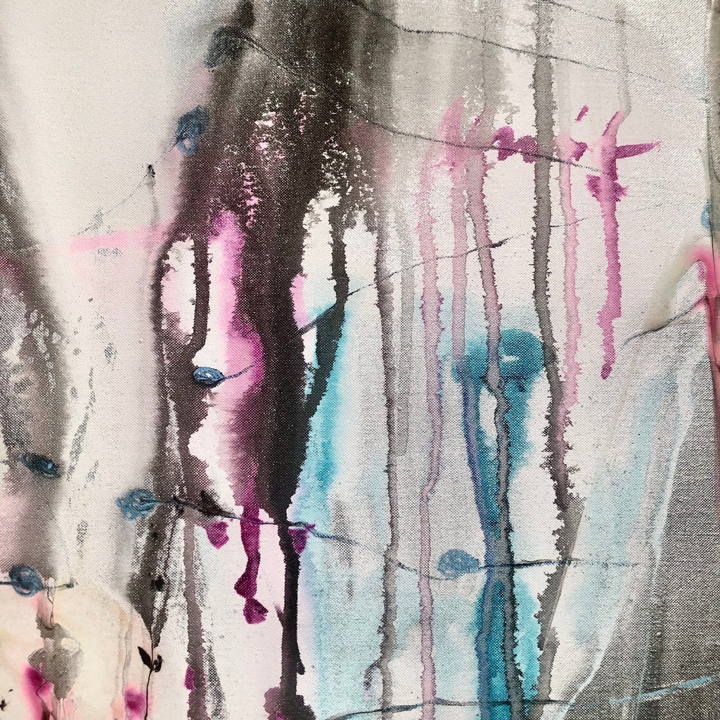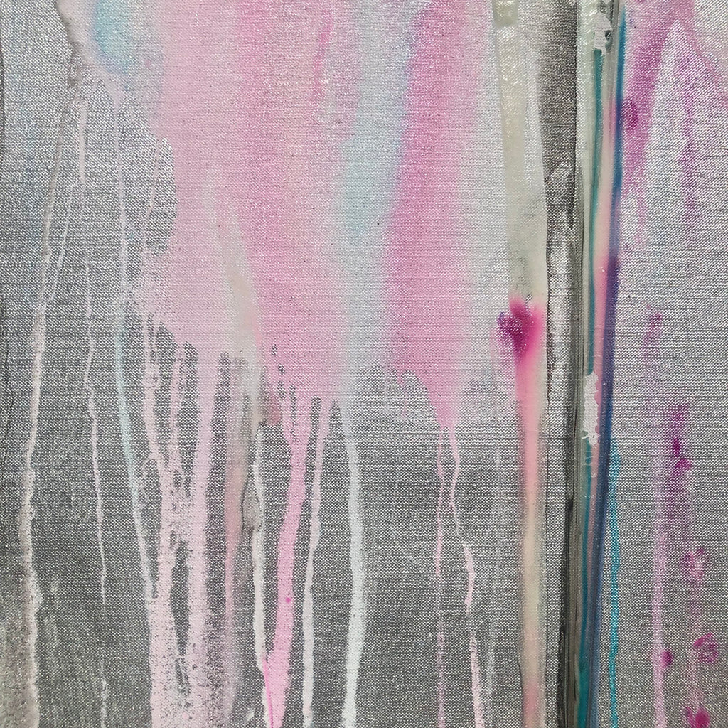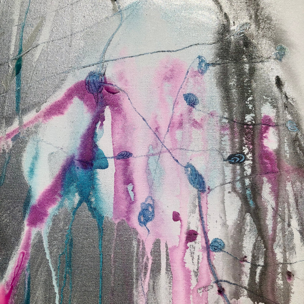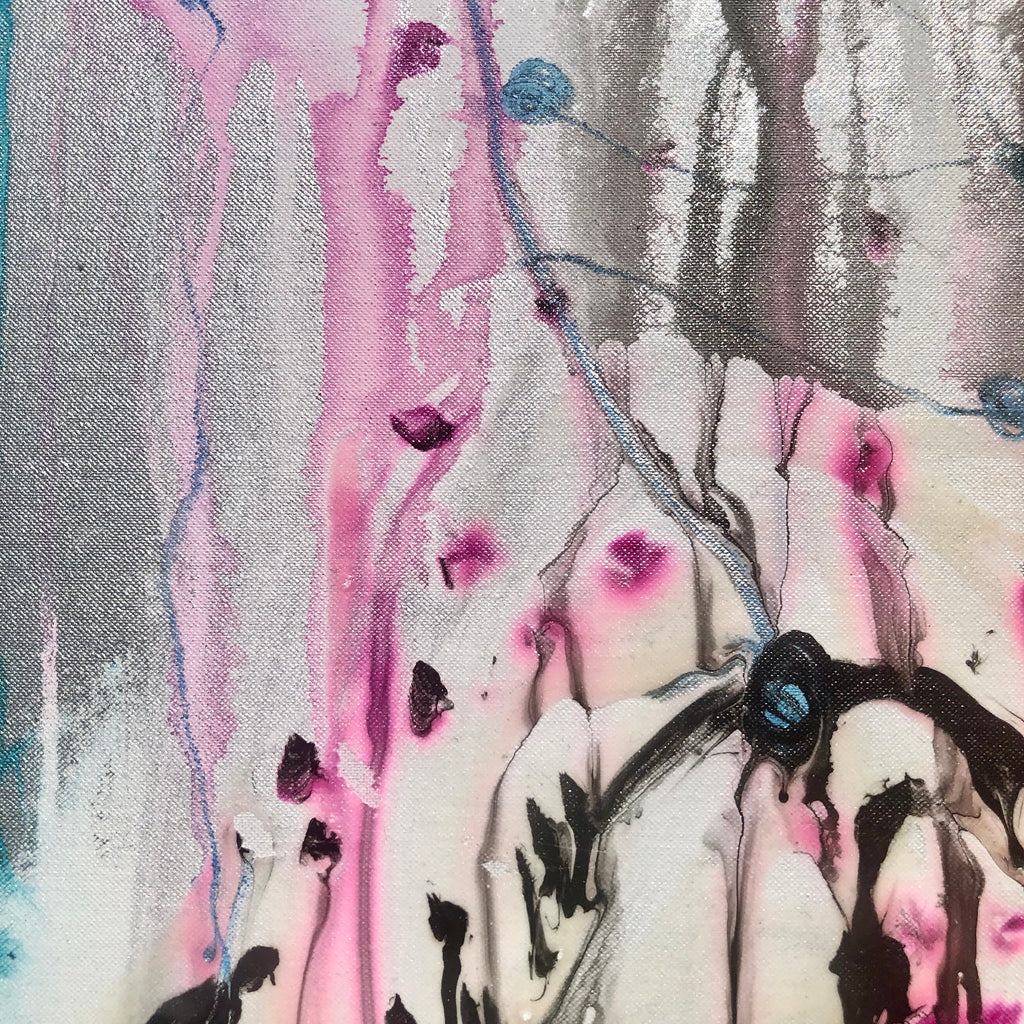 Mixed technique: Silver pigments, colored inks pink&blue, glue, black ink on canvas