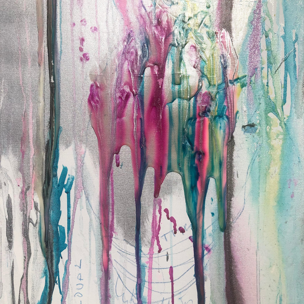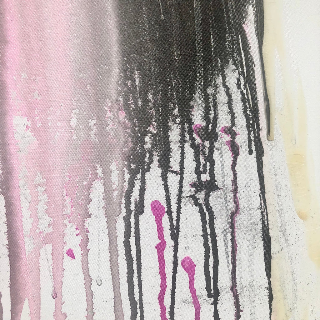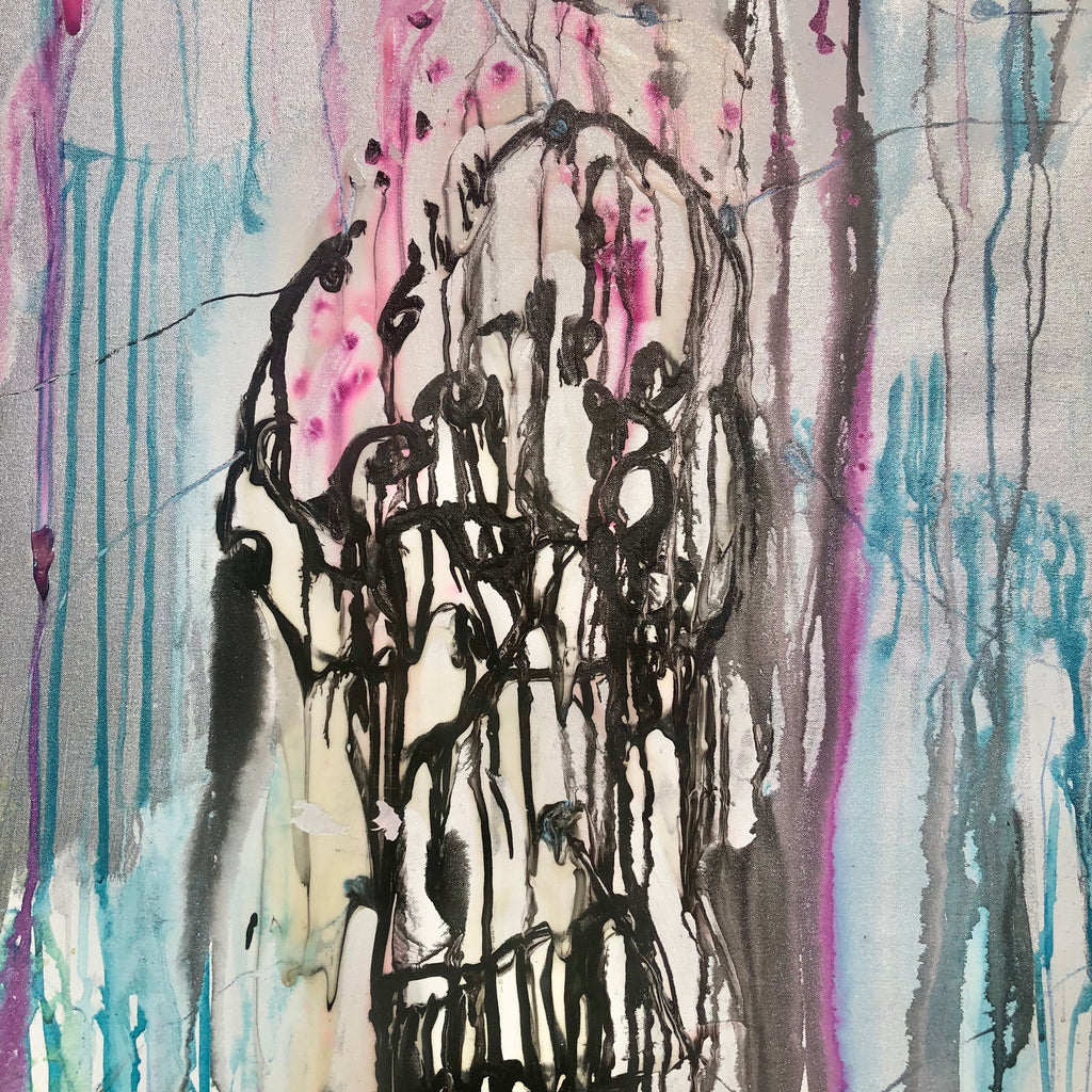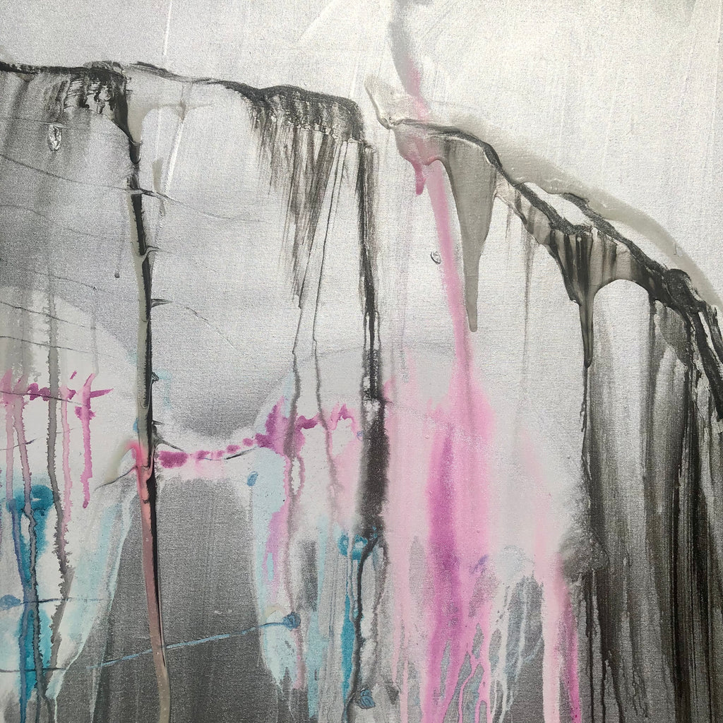Mixed technique: Silver pigments, colored inks pink&blue, glue, black ink on canvas