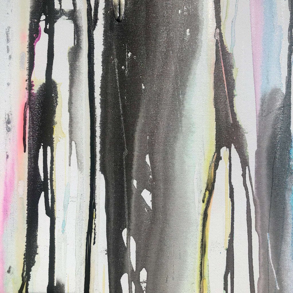 As Art critics say, James creates a kind of cartography of the person, playing with colors, drips, words as a record of the painting session. Very fresh and blooming details are contrasting with the black and silver grey background of the canvas. The background in silver pigments changes with the weather, the light in your space. The painting creates intimacy in spacious spaces like offices or large living rooms.