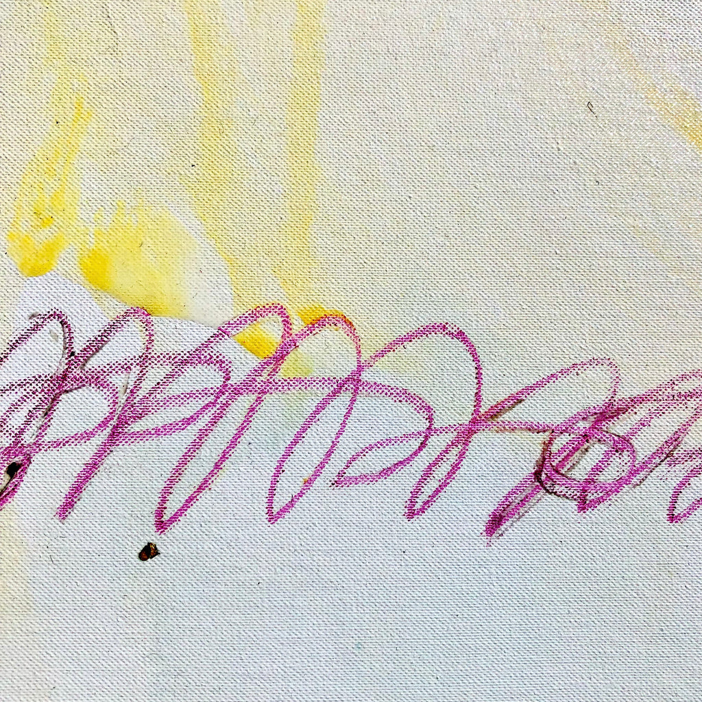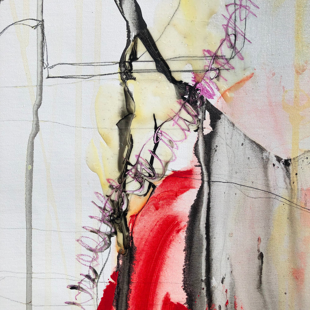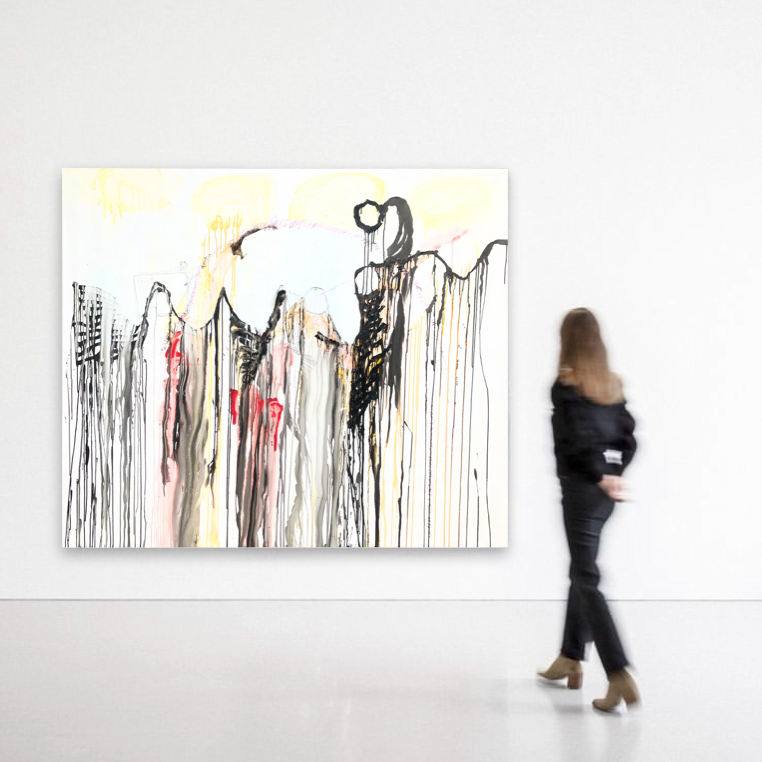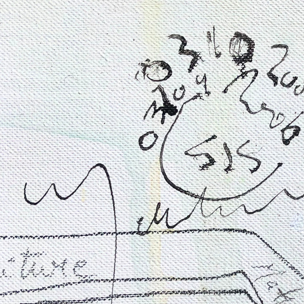 XL complex and colourful painting inspired by a photograph artist and his baby, came to the James's Dordogne-studio on a beautiful September afternoon. The skein of vertical runs and the many pictorial events on the frame are the expression of the indissociable relationship between a mother and her child. Get touched by these fluid lines and waves like music melodies and string vibrations of musical instruments.