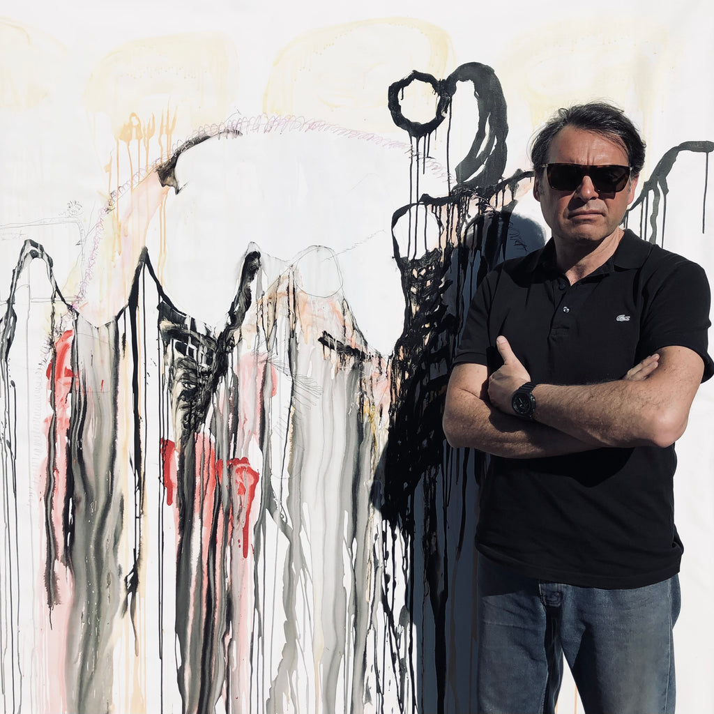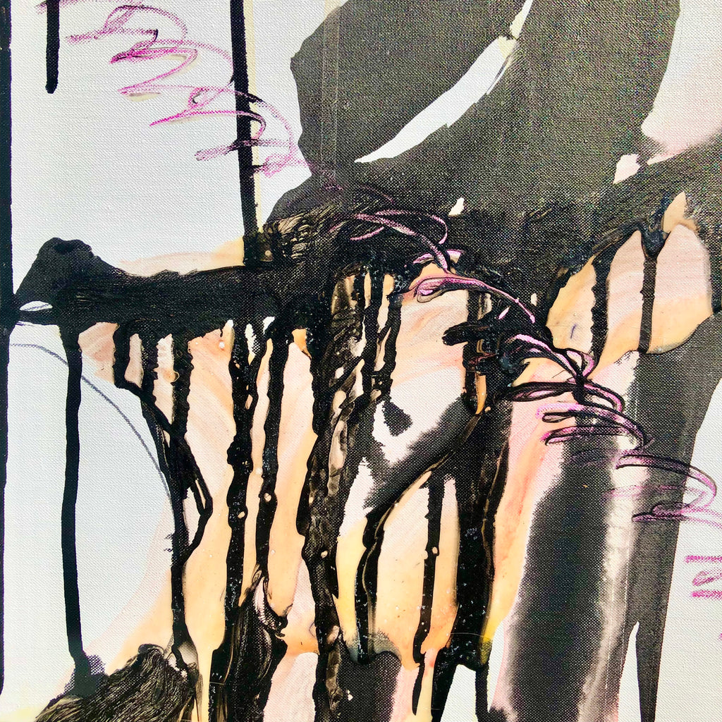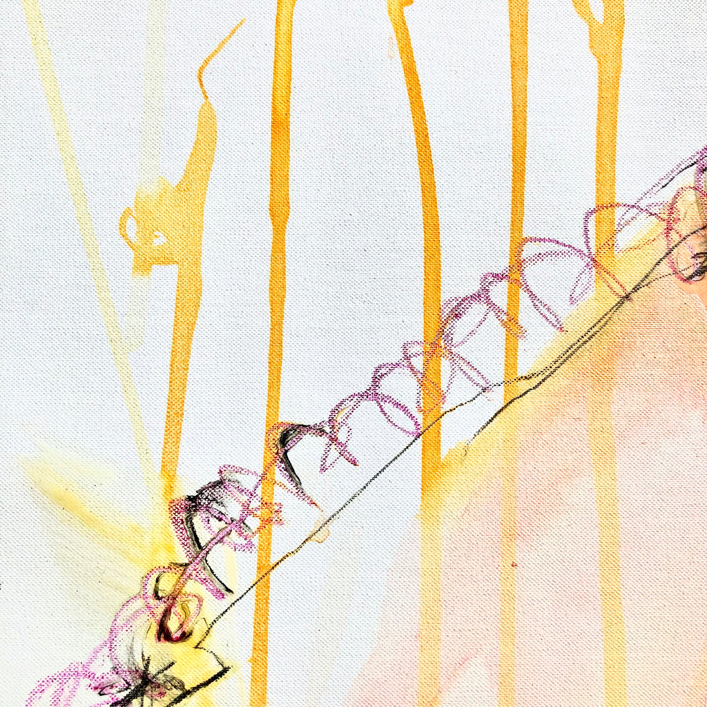 XL complex and colourful painting inspired by a photograph artist and his baby, came to the James's Dordogne-studio on a beautiful September afternoon. The skein of vertical runs and the many pictorial events on the frame are the expression of the indissociable relationship between a mother and her child. Get touched by these fluid lines and waves like music melodies and string vibrations of musical instruments.