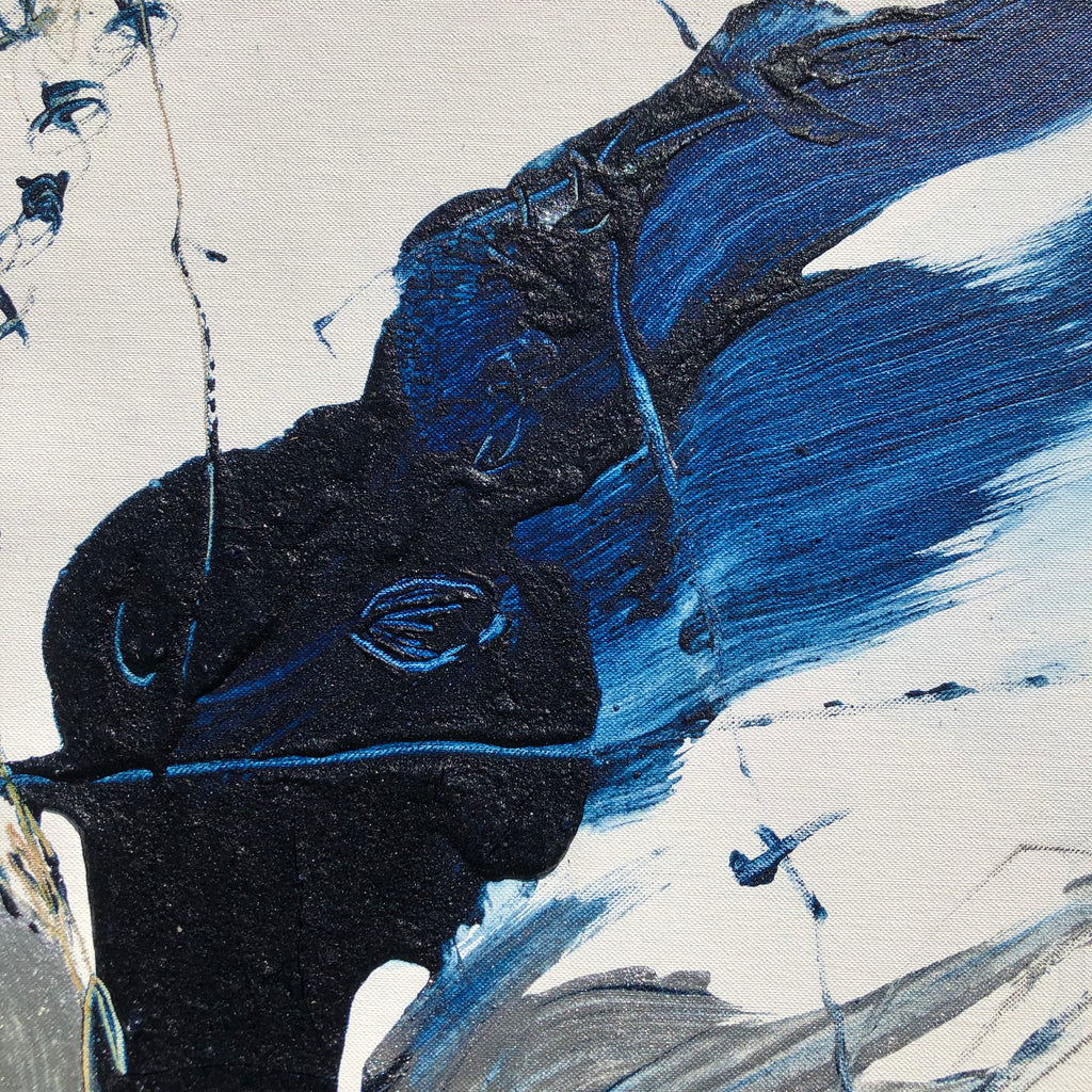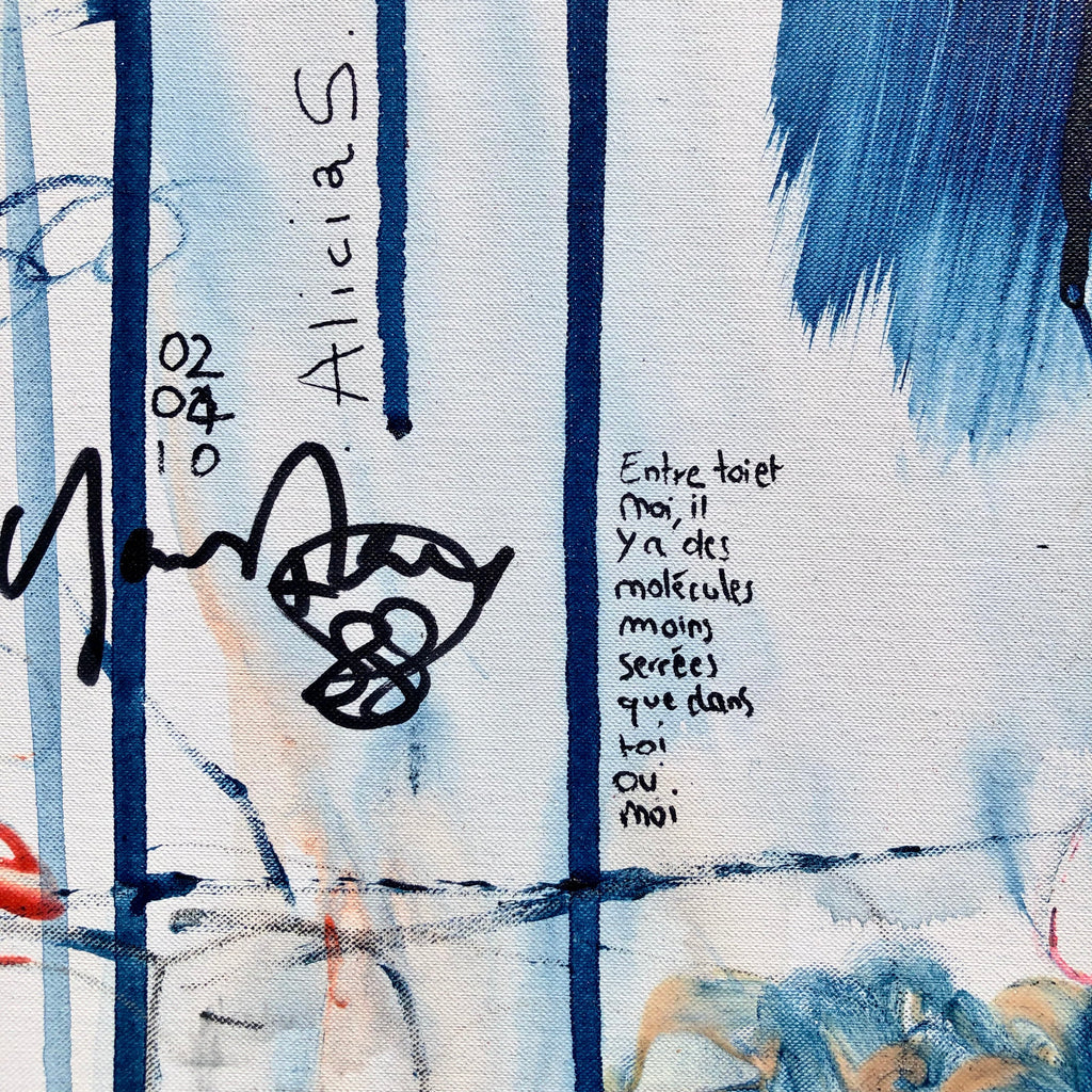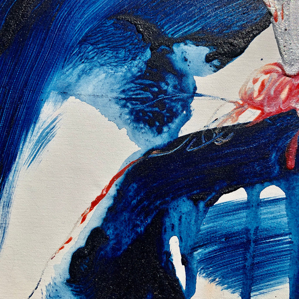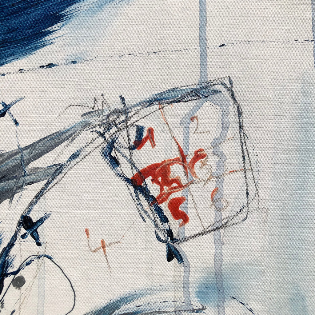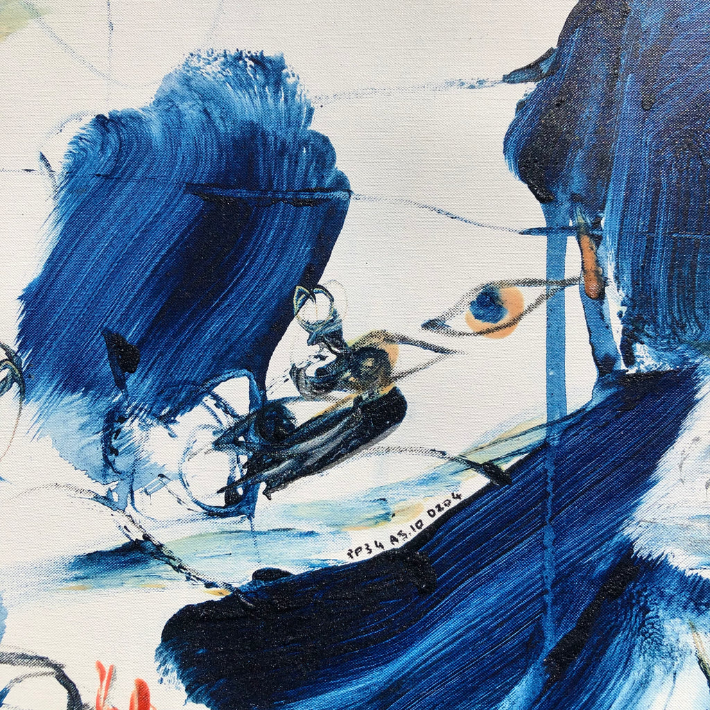This XL painting is like a landscape with its furious mountains and welcoming valleys. There is a large space of the white canvas to make the painting breathe. Intensity with the deep blue and orange…