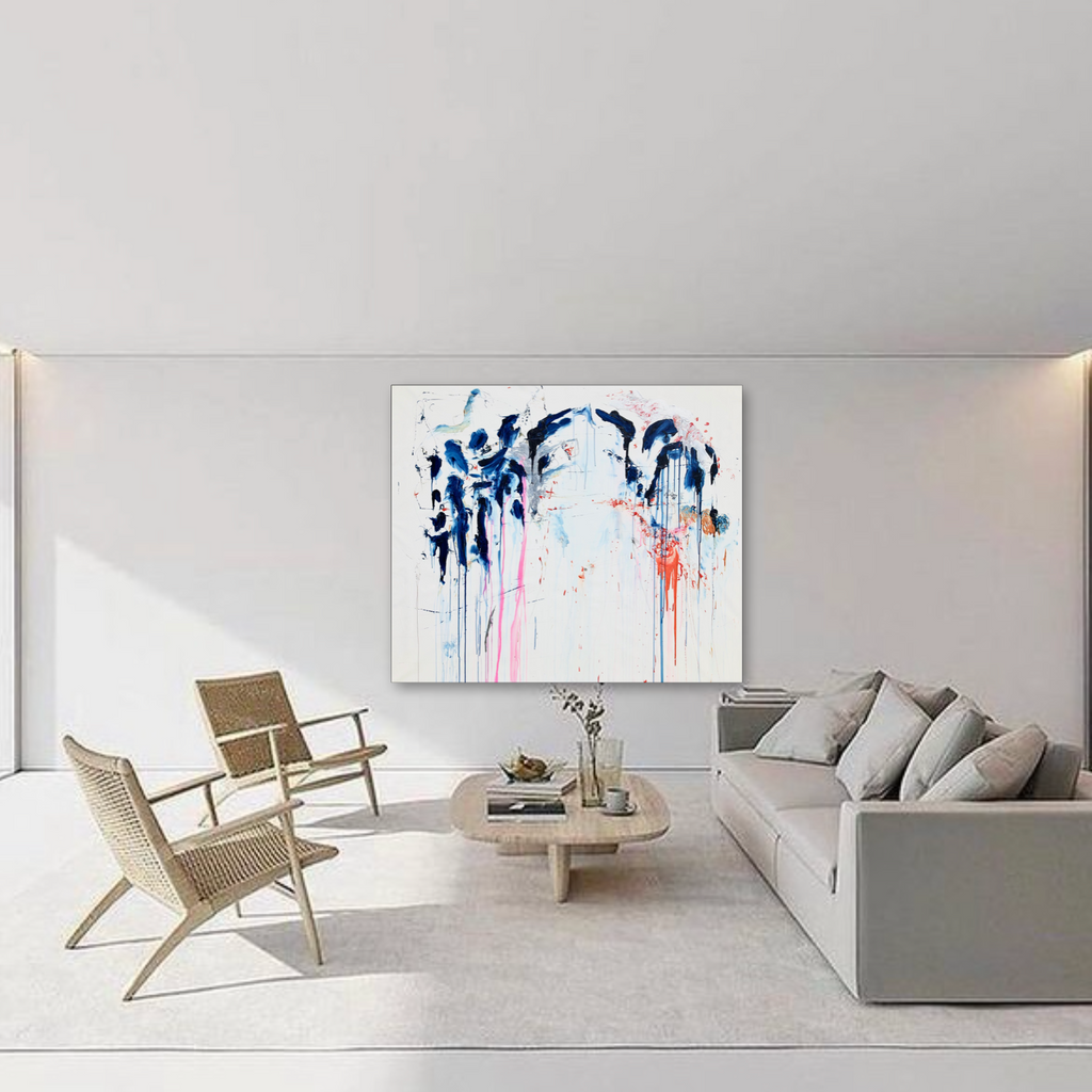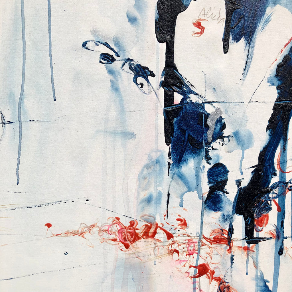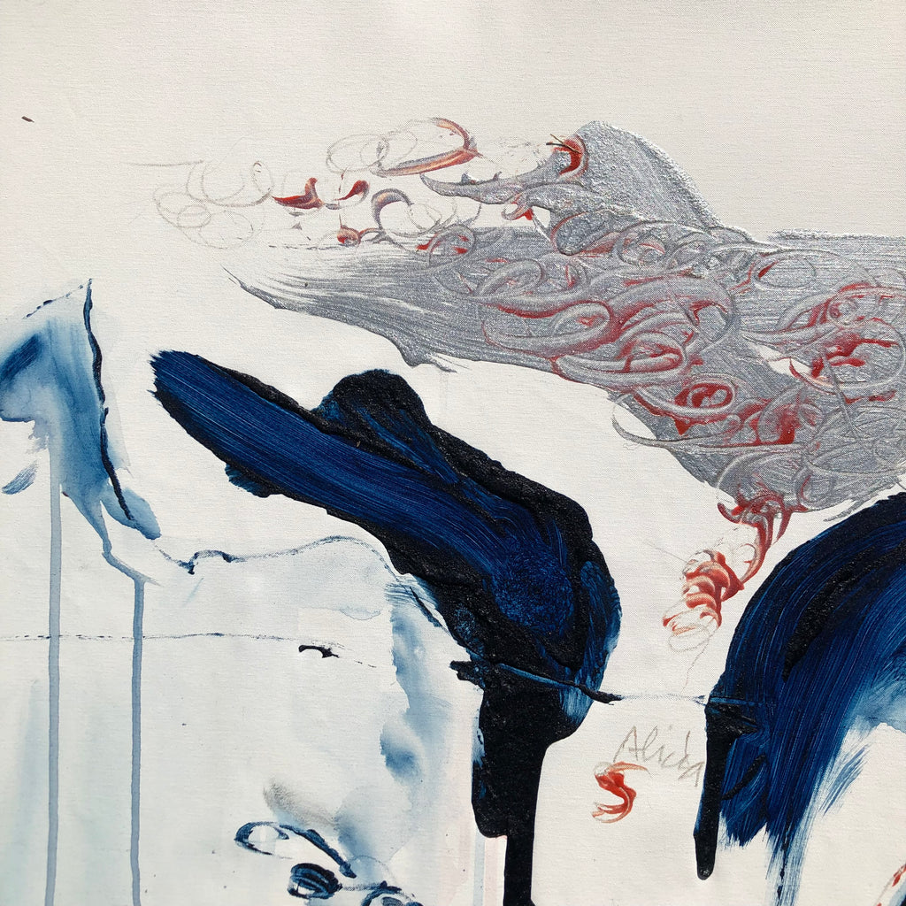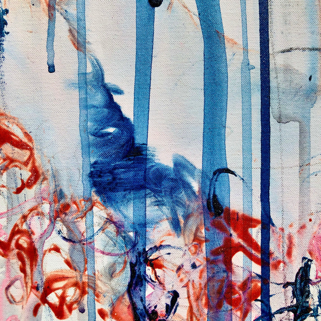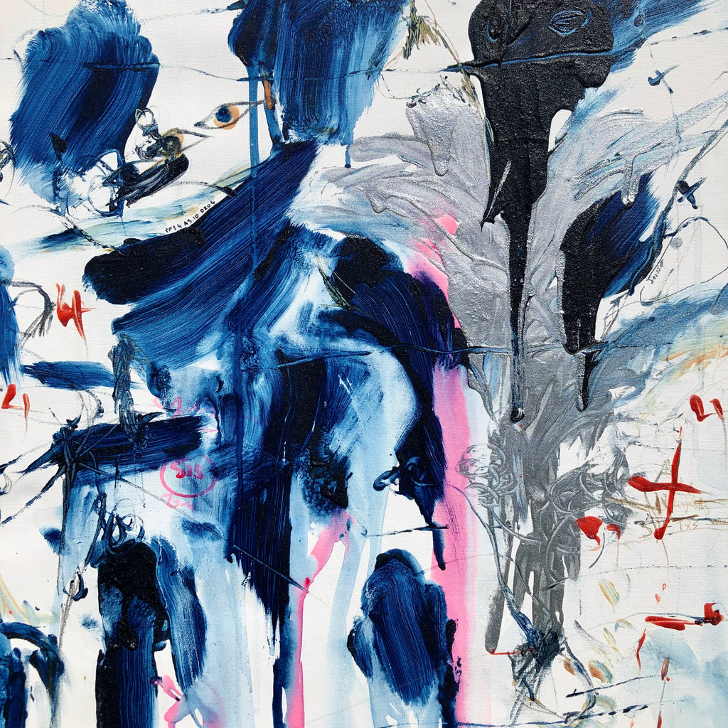 This XL painting is like a landscape with its furious mountains and welcoming valleys. There is a large space of the white canvas to make the painting breathe. Intensity with the deep blue and orange…