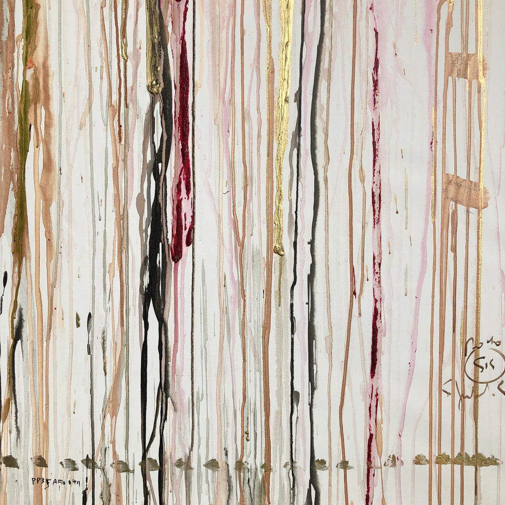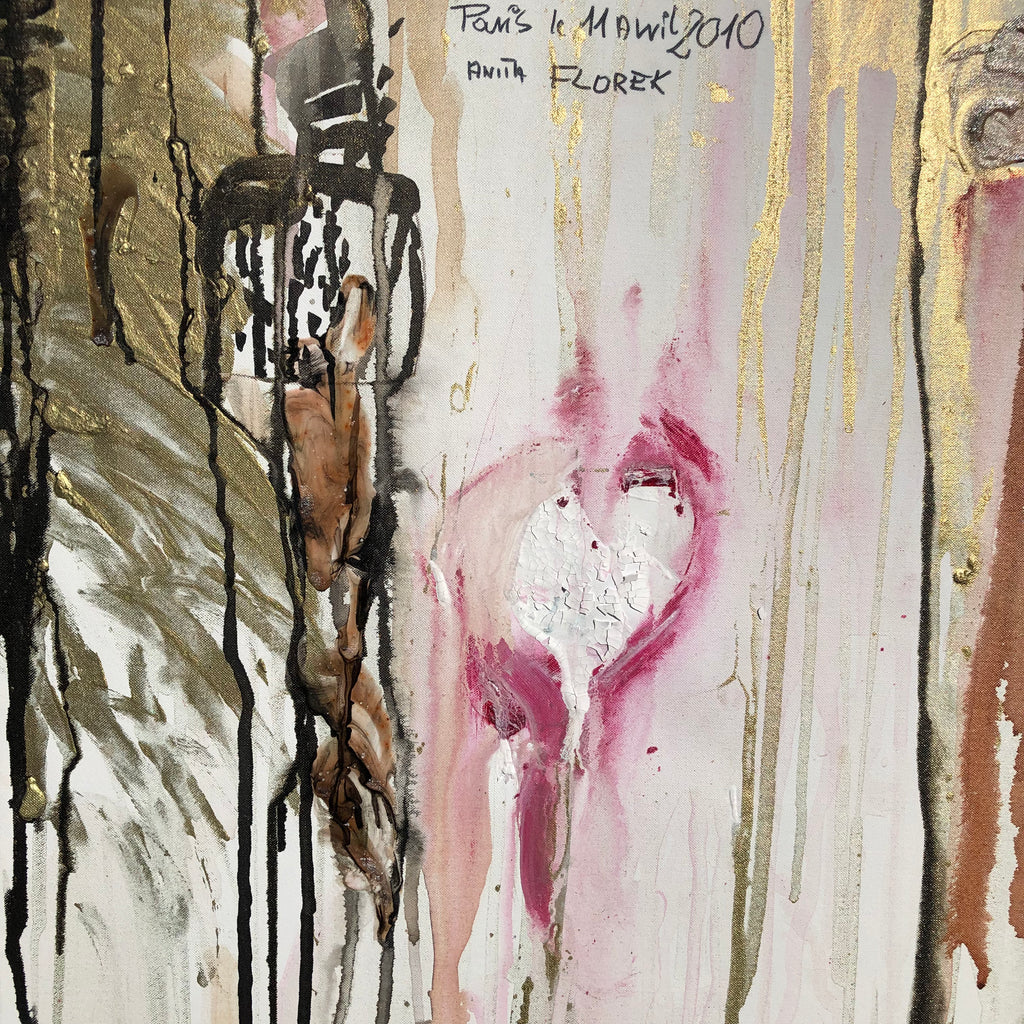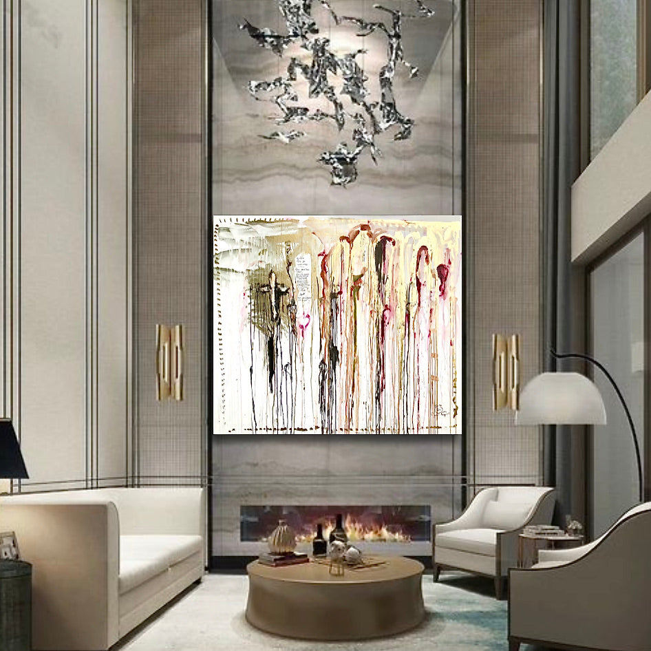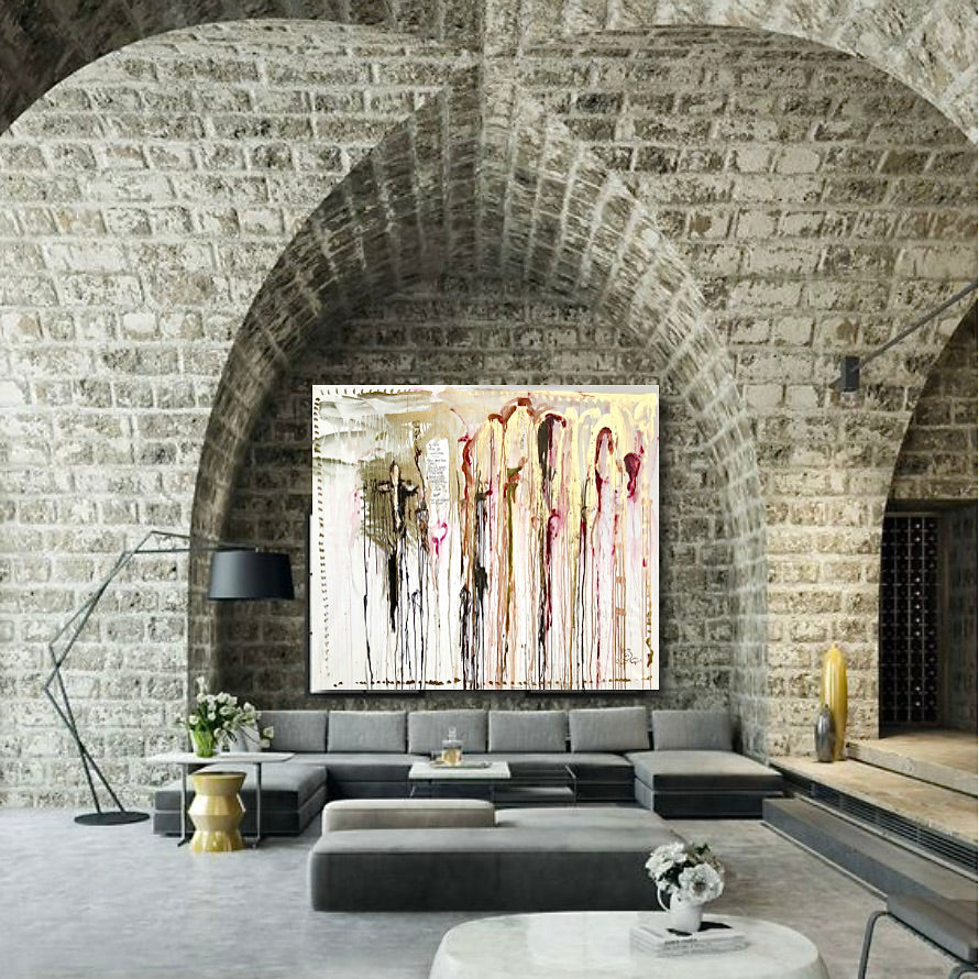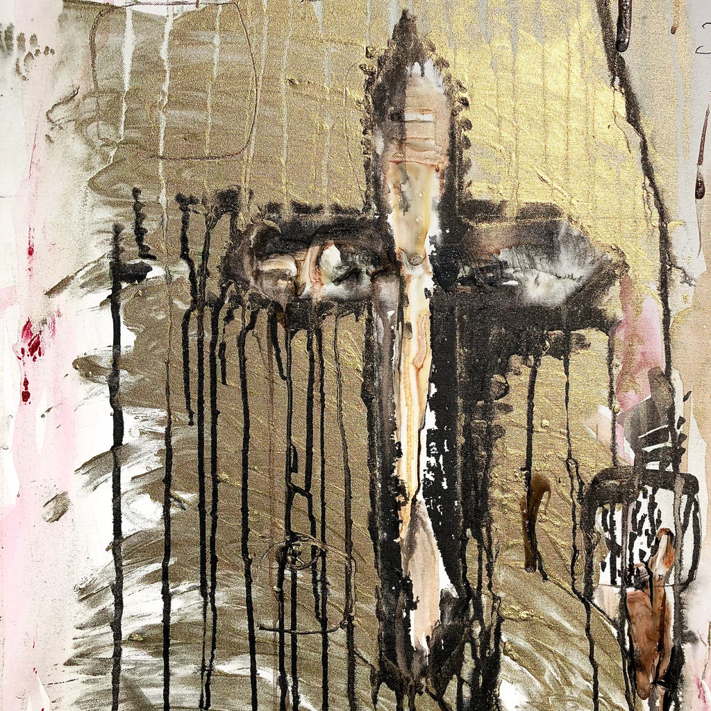 This painting is inspired by an artlover who believes in God. She is from Poland, living in Paris. Interesting talk about faith in God, which is an important component of Polish culture. It inspired James for the golden cross, one of the figurative elements of this abstract canvas...