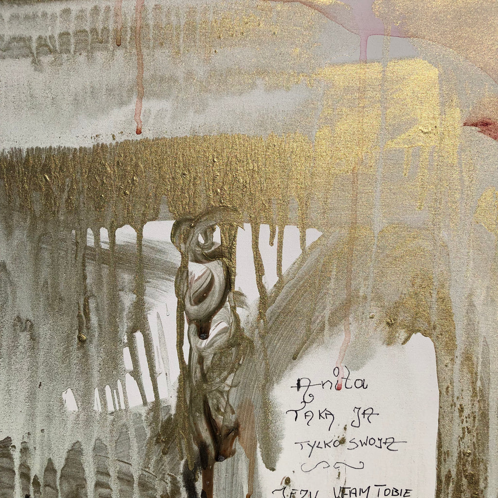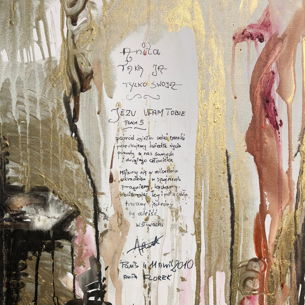 James used a lot of golden pigments. He was inspired by the gold leaf background of religious icons that represent divine light. There are a lot of religious Christian signs like in the religious architecture or religious icons. James let the model write a psalm on the canvas. Letting the person write on the Presence painting canvas is proof of the model’s presence at a given time. A kind of strong authentication of the artwork. To tell you the entire truth, the painting session took place just few hours after the airplane crash with the president of Poland Lech Kaczynski on board. As a Poland citizen she was very shocked. So this painting is like a prayer for those 96 persons who lost their lives and their loved ones.