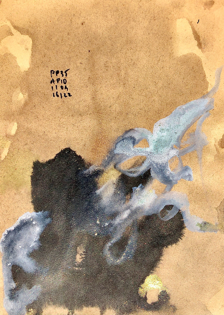 This XS painting is made on beige recycled paper, in James’s own watercolor technique. The beige of the paper is used as a background color. A powerful palette of blacks and whites creating a stormy atmosphere...