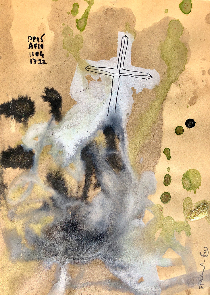 This XS painting is made on beige recycled paper, in James’s own watercolor technique. The beige of the paper is used as a background color. A powerful palette of blacks and whites creating a stormy atmosphere. And emerging from green (hope) a white cross (peace)...