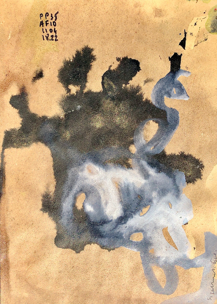 This XS painting is made on beige recycled paper, in James’s own watercolor technique. The beige of the paper is used as a background color. A powerful palette of blacks and whites creating a stormy atmosphere...