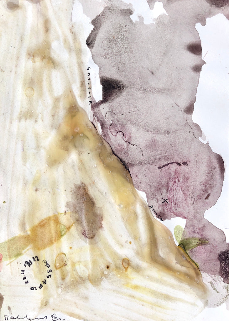 XS painting with a very soft palette of light roses and cool beiges creates a peaceful atmosphere.This painting was made the day after the airplane crash, in Slomensk (10/04/2010). That’s why you encounter writtten words linked to this disaster and the liquid paint evokes the bad weather...
