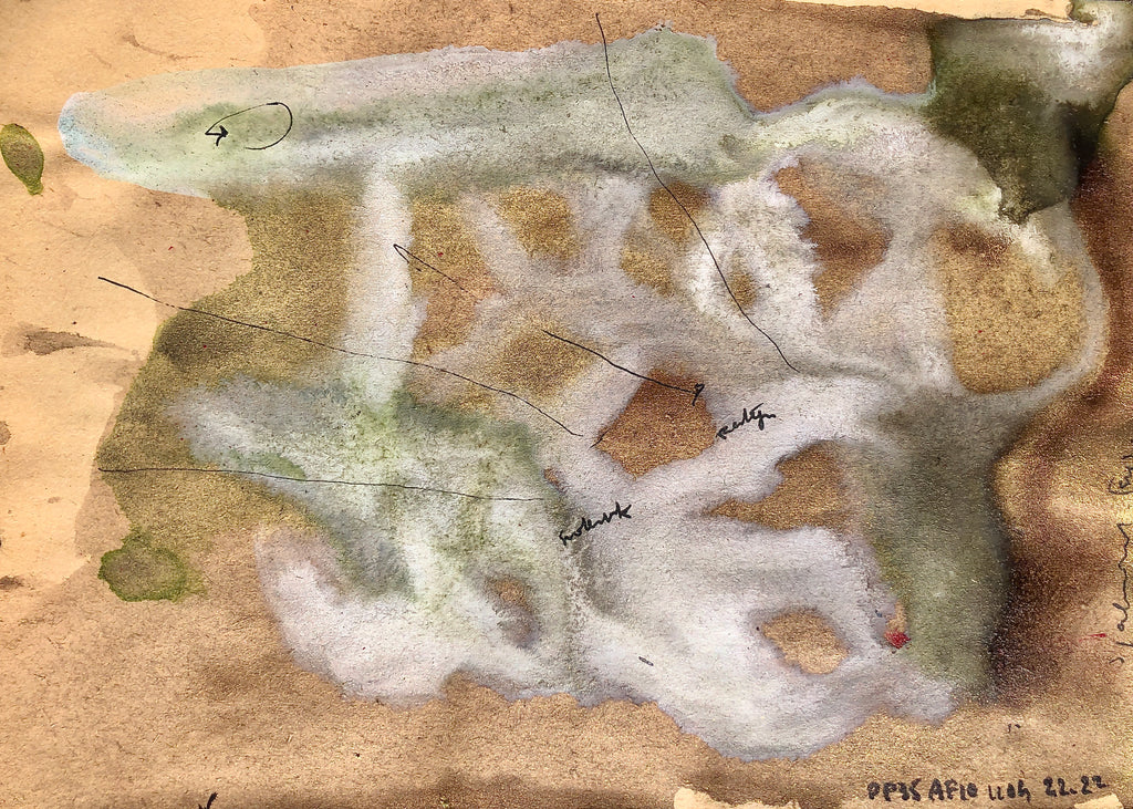This XS painting is made on beige recycled paper, in James’s own watercolor technique. The beige of the paper is used as a background color. A very soft palette of light golds, cool whites and beige, he creates a peaceful atmosphere after the storm...