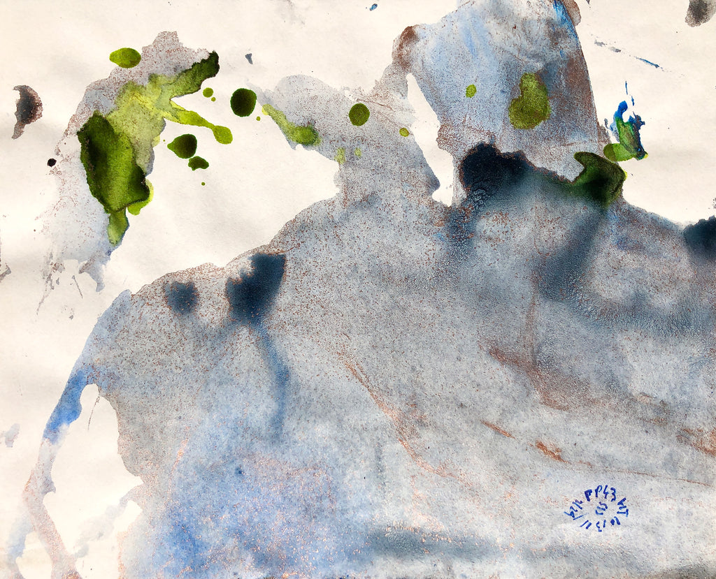 Mixed technique: Colored pigments, glue, green-blue ink on paper