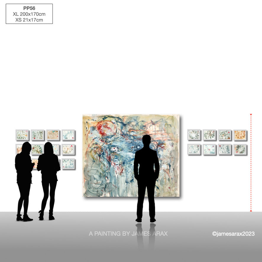 … A well-being atmosphere thanks to the strong red kind of Sun.The blues color variations and shapes give us a sunset stunning sky. A strong painting for those who need both energetic and peaceful window in their space. James played with the theme of red dot, from the large red Sun he can observe from his studio every evening to the small red dot on the forehead of his model. They were joking about it so much so « Sniper » became his model’s nickname.