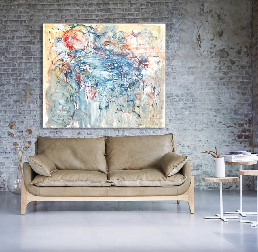« THE SNIPER » XL painting with powerful energy and creativity. This painting is like a beautiful sunset, perfect to give a warm and mild mood in an interior with the blues, yellows and reds-oranges colors.