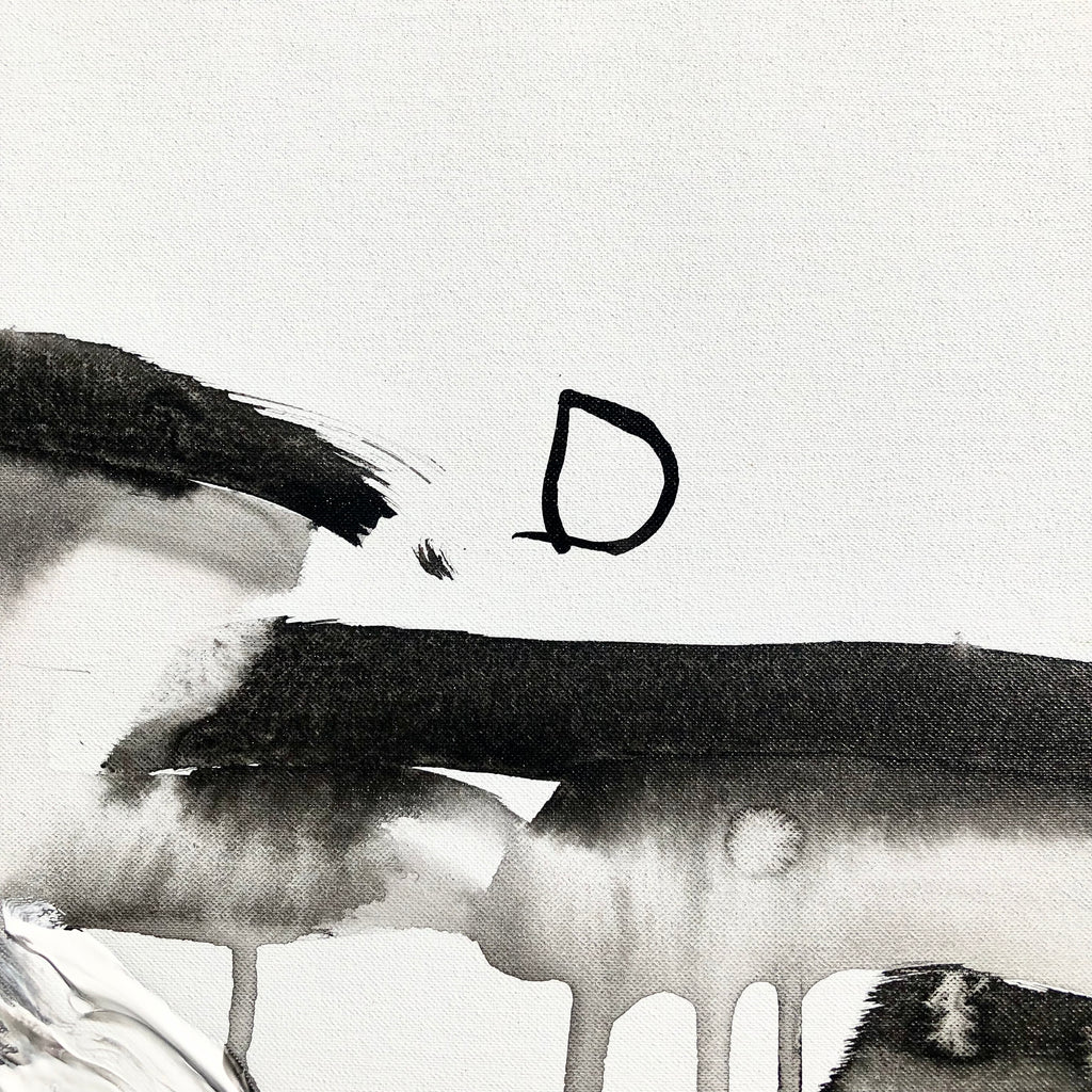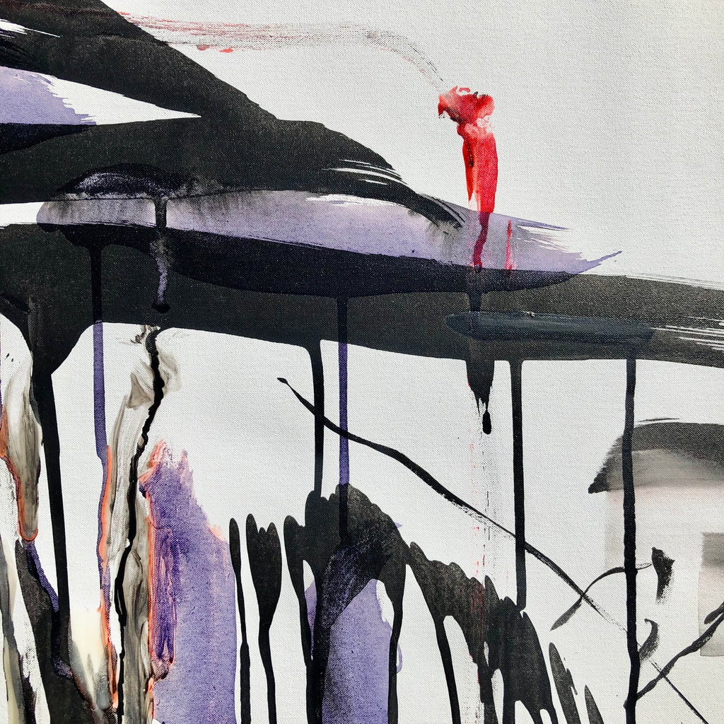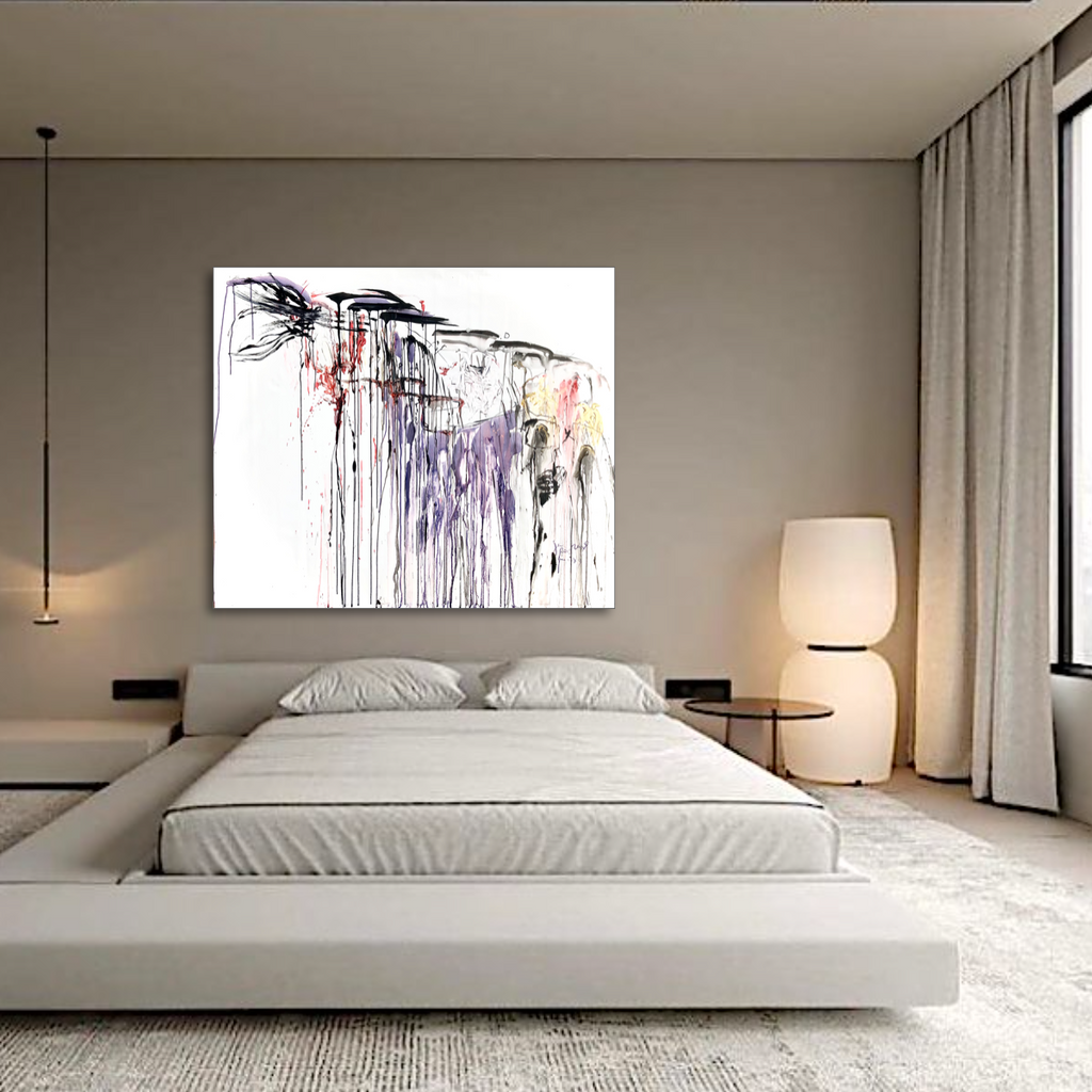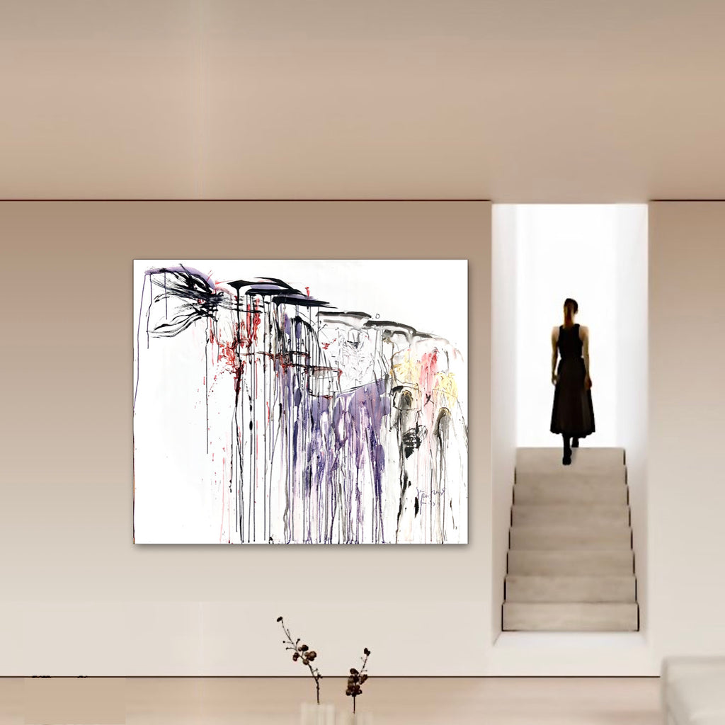 … The painting is very strong with its long black lines like a waterfall in your space. It is the perfect painting for minimalist interiors as proposed in the pictures staged. It brings both movement and softness. The critics say this painting with James’s OpenFlow style is like a large kanji (Chinese character) with all his creativity and freedom. James has always been inspired by ancient techniques of Chinese calligraphy, reinterpreted here in a contemporary and arty vision.