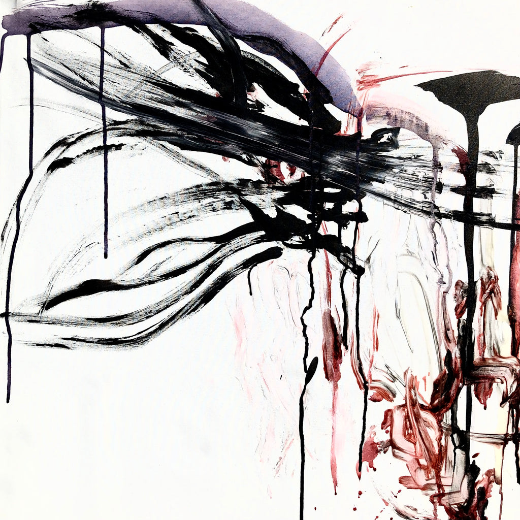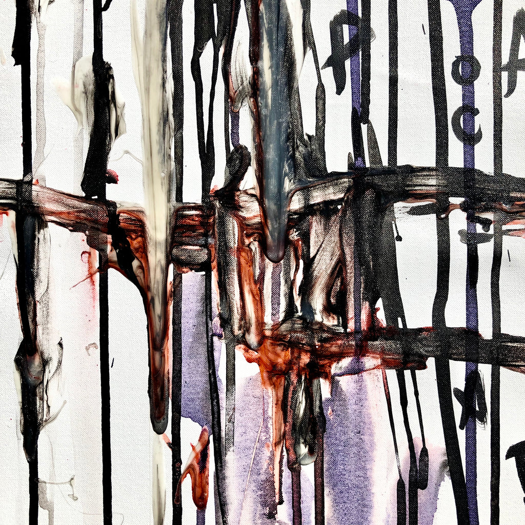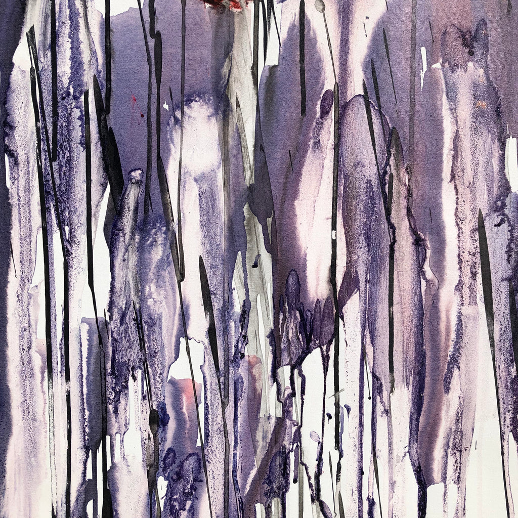 XL painting. A mix between strength and refinement. A beautiful abstract portrait with a great balance of colors between the purples, hints of red and white and the golden pigments. There is like a sculpture in black, like a Japanese calligraphy…