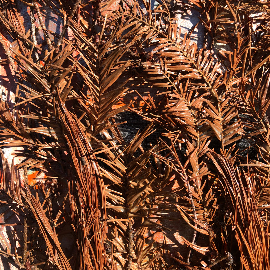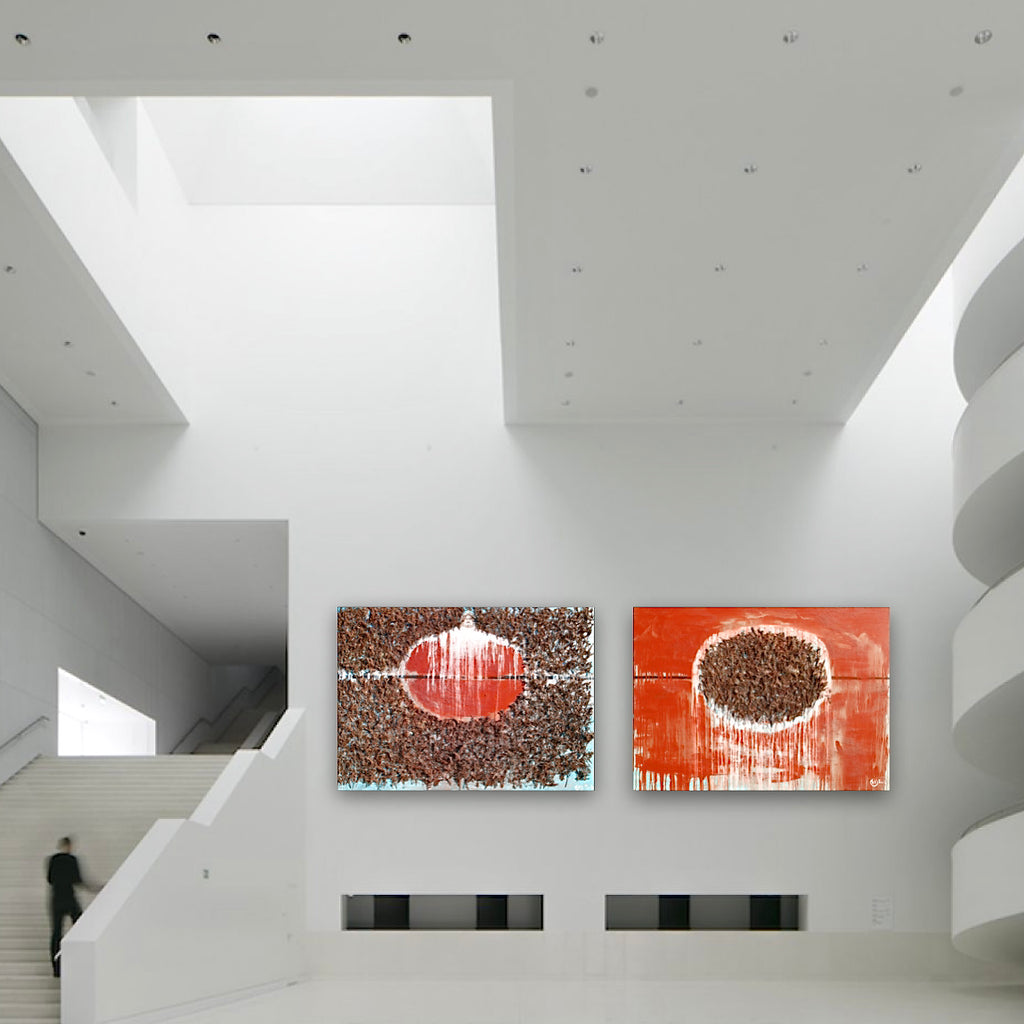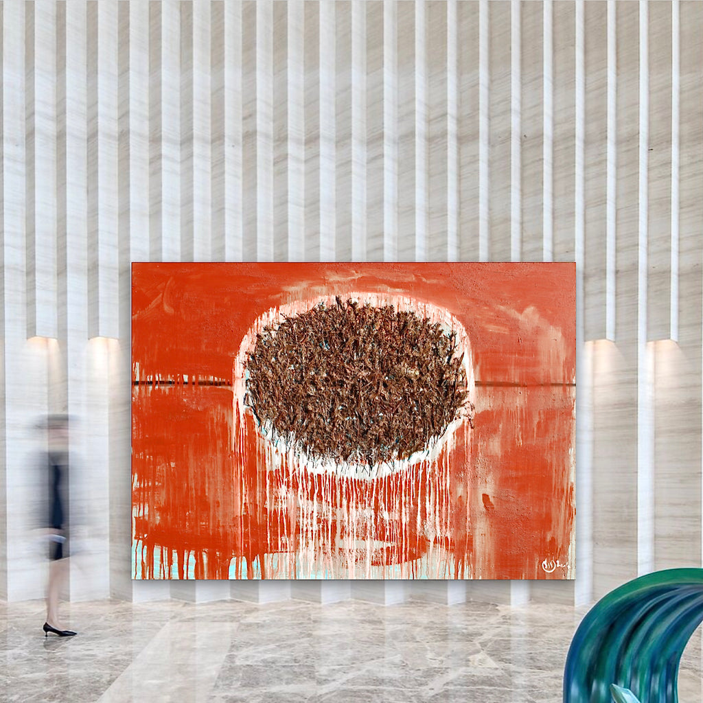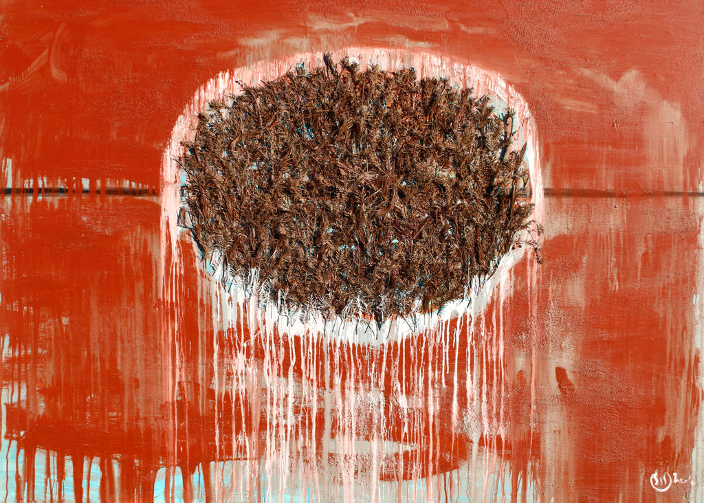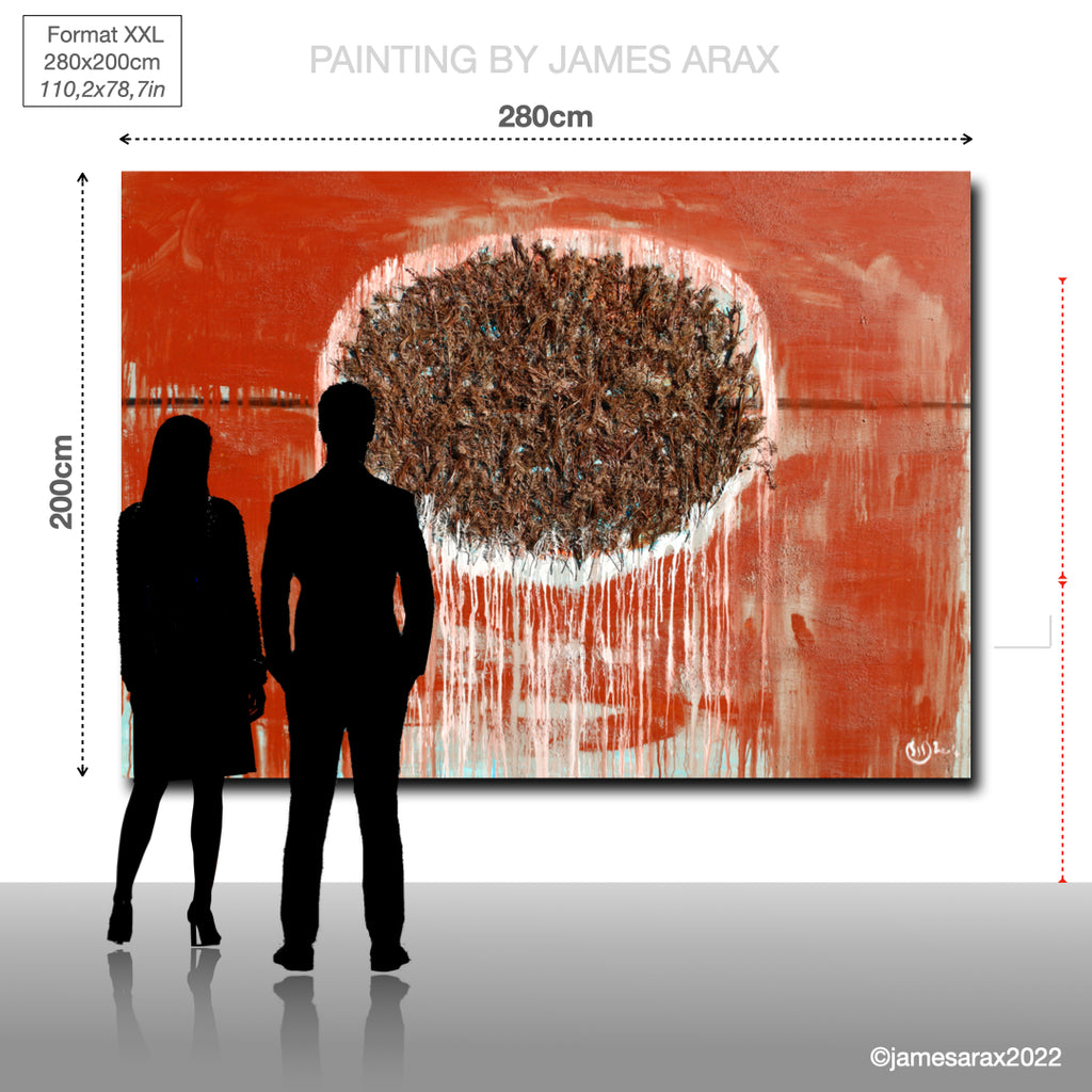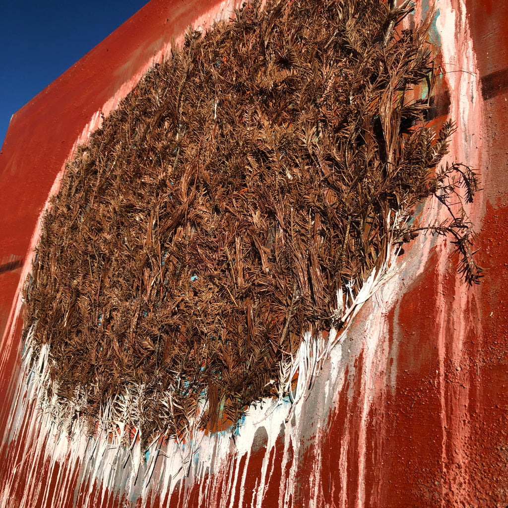 Notes : This painting was made with pine branches from trees fallen during the violent storms Lothar and Martin in December 1999, in Europe. These 2 storms ravaged the forests of France, Switzerland, Germany and Denmark. James picked up the pine branches after the storms and kept them to make THE END OFTHE FOREST in 2004 in tribute to the forests. In particular its forest "Le bois d'ARAX" which was seriously affected by the storm.