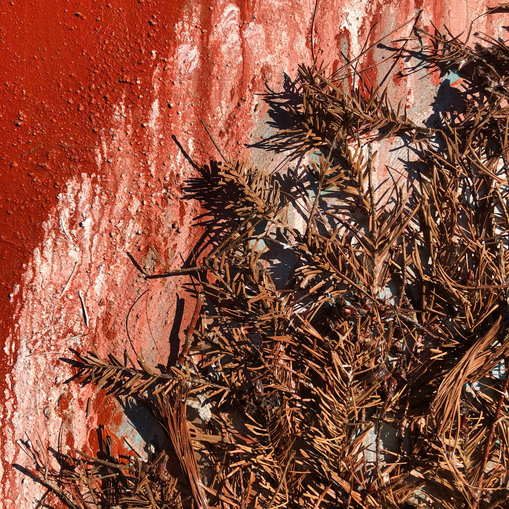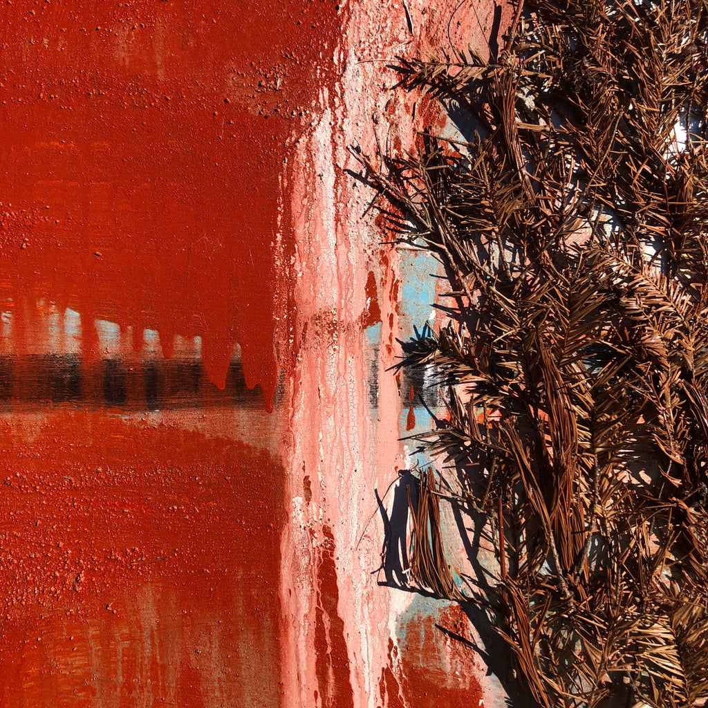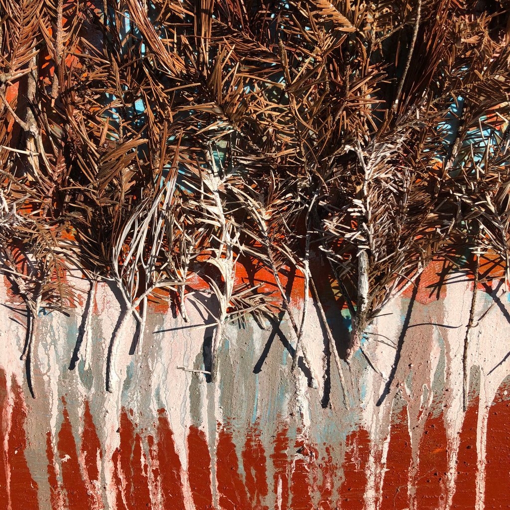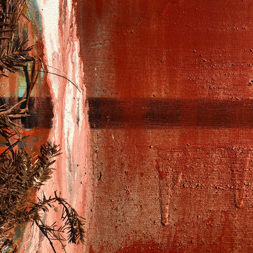 Mixed technique: Colored pigments, glue, white ink&paint, pine branches on canvas
