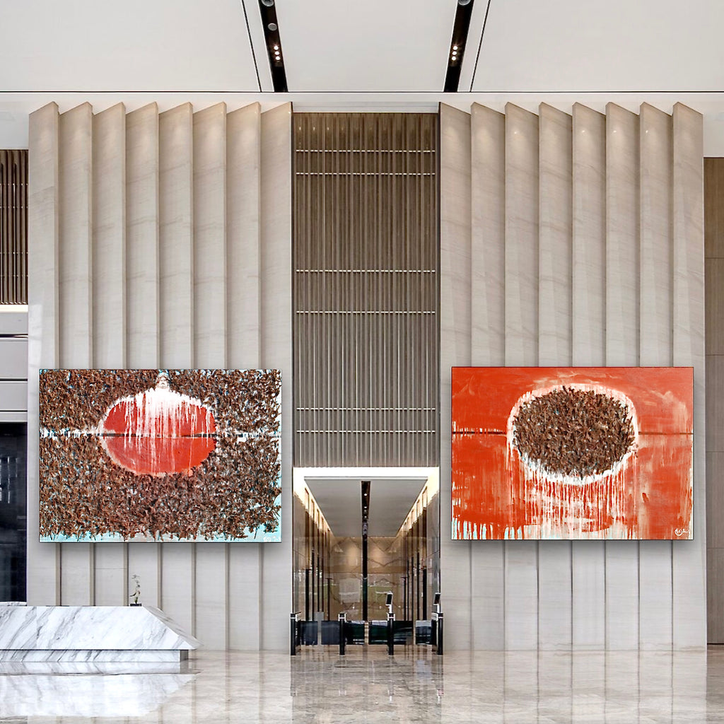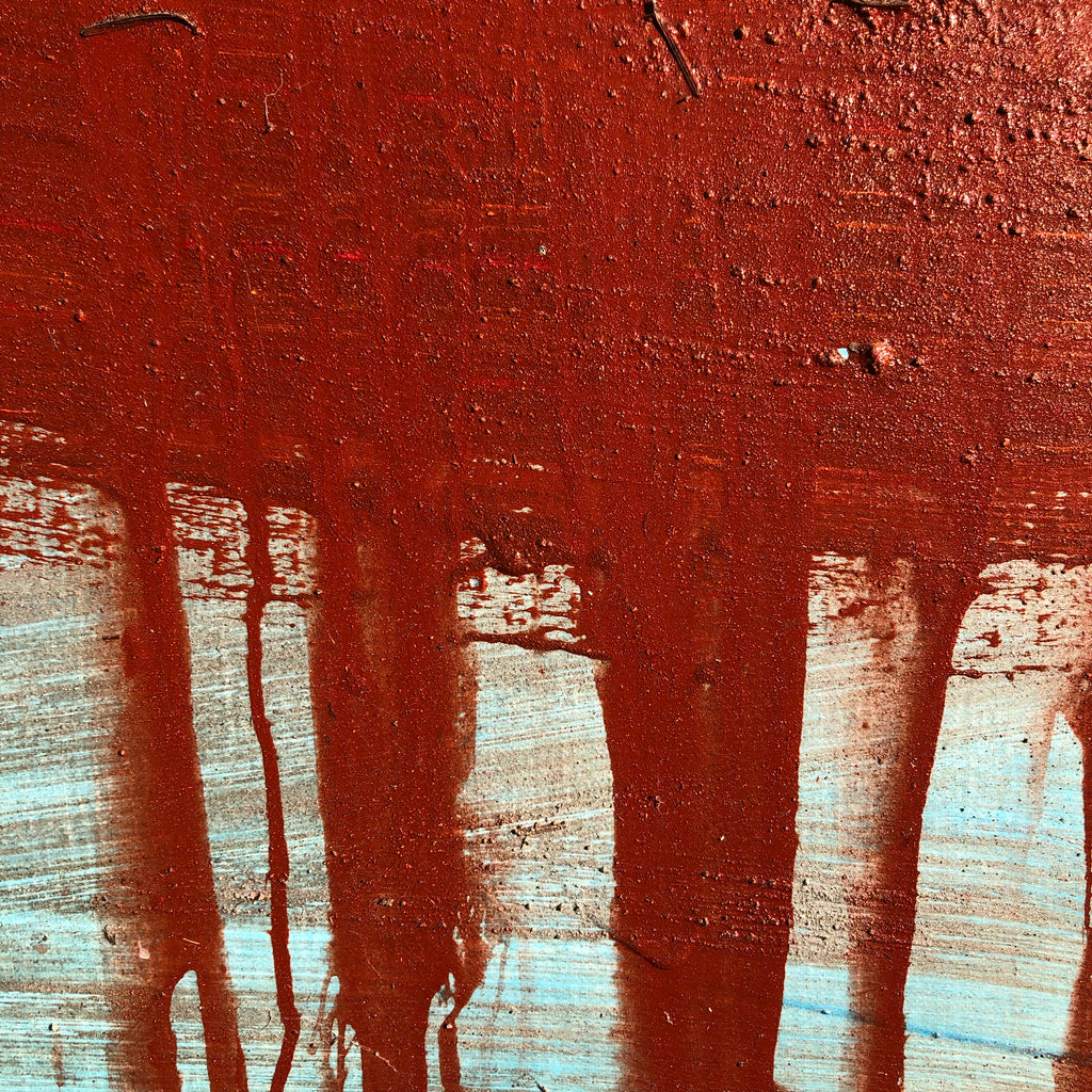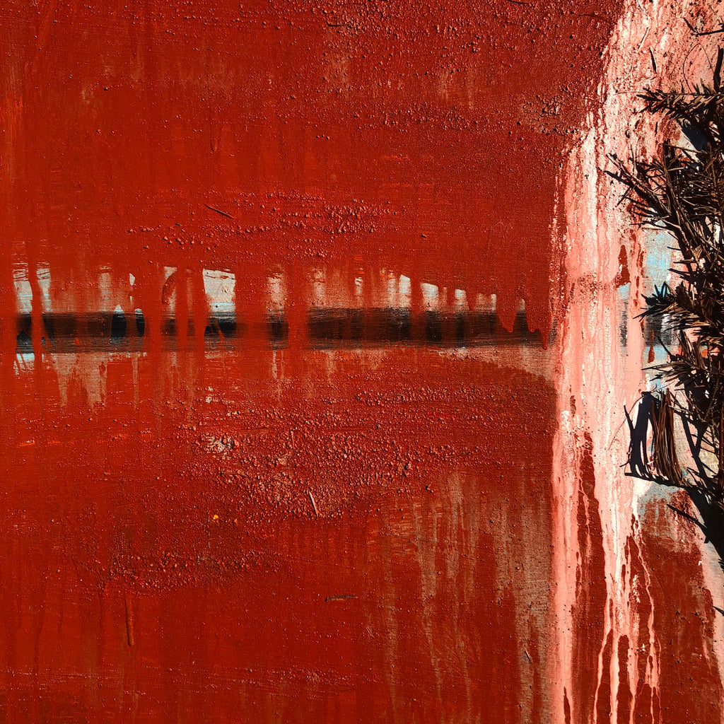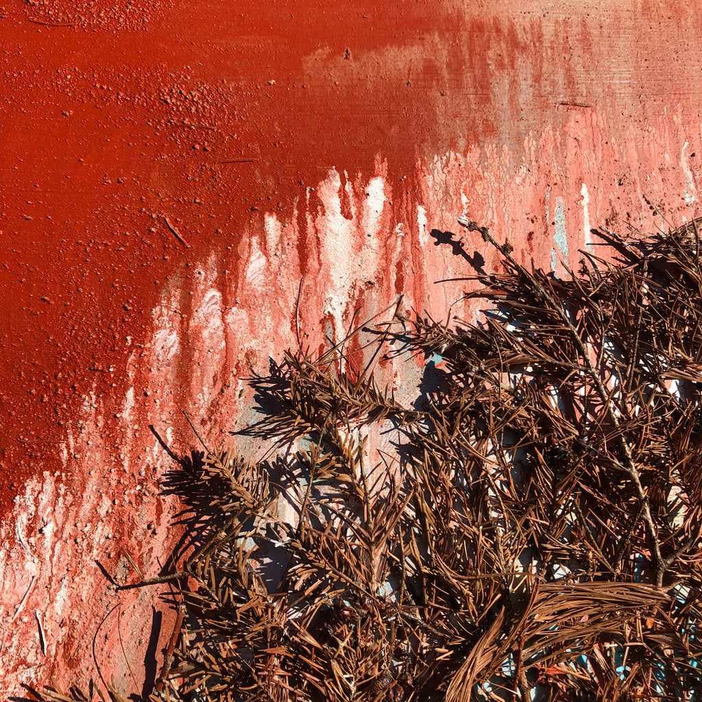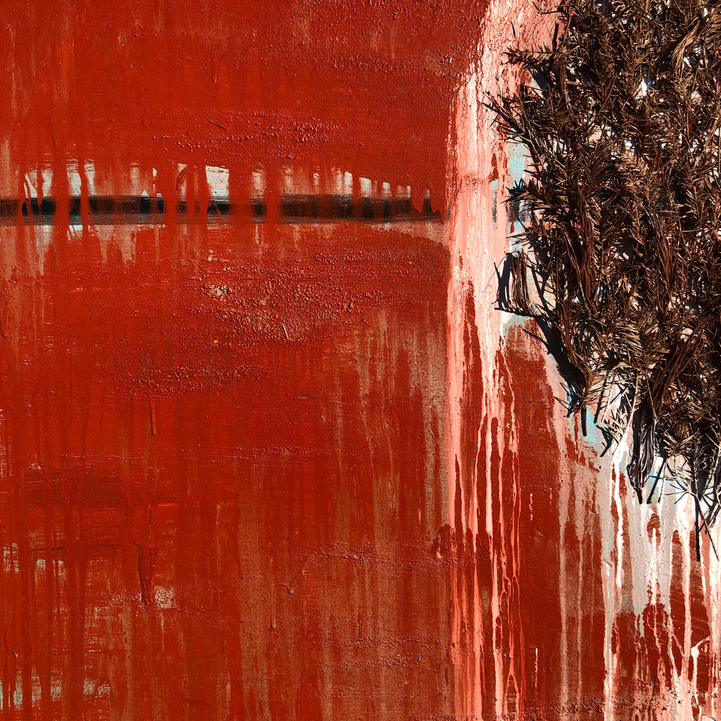 Mixed technique: Colored pigments, glue, white ink&paint, pine branches on canvas