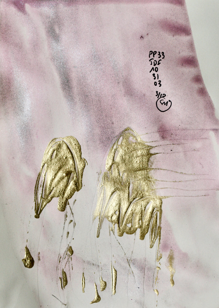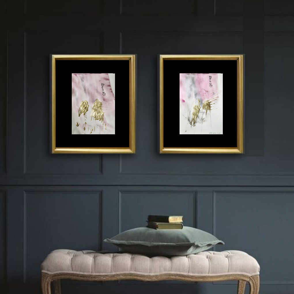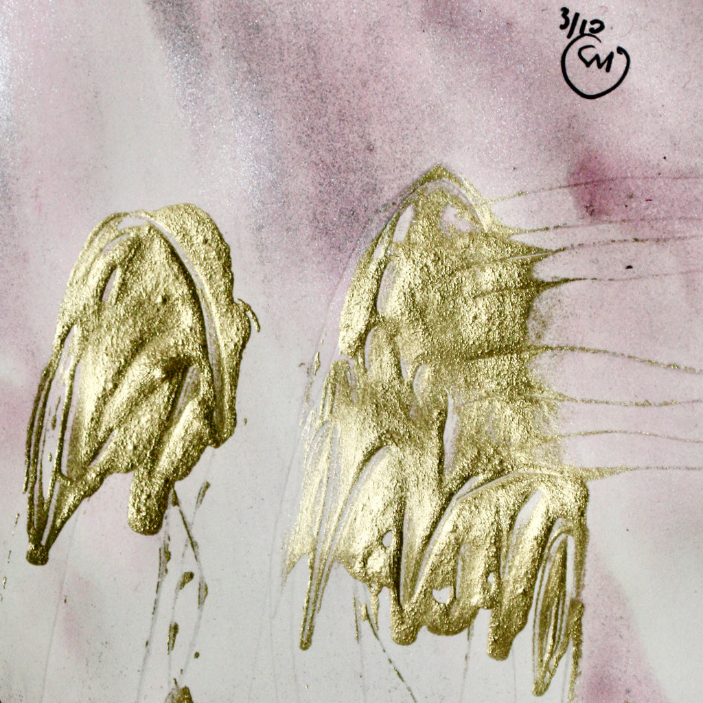 James always creates with the idea of sustainability. All the more that when he achieves a large scale painting he always gets ideas or inspirations that still are in his mind. So he continues the series on this smaller size. Here on paper until the end of inspiration, until the end of paint. Subtle balance between the white of paper, the golden matter and the light pink. Very poetic and chic.