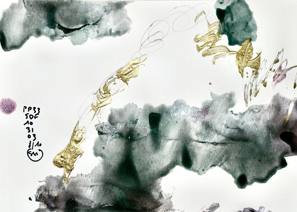 MAGIC CLOUD, Light black and gold, as if we were in the sky with the clouds. James plays with the white of the paper as the main color of the painting. The spirit of Chinese landscapes id not so far.