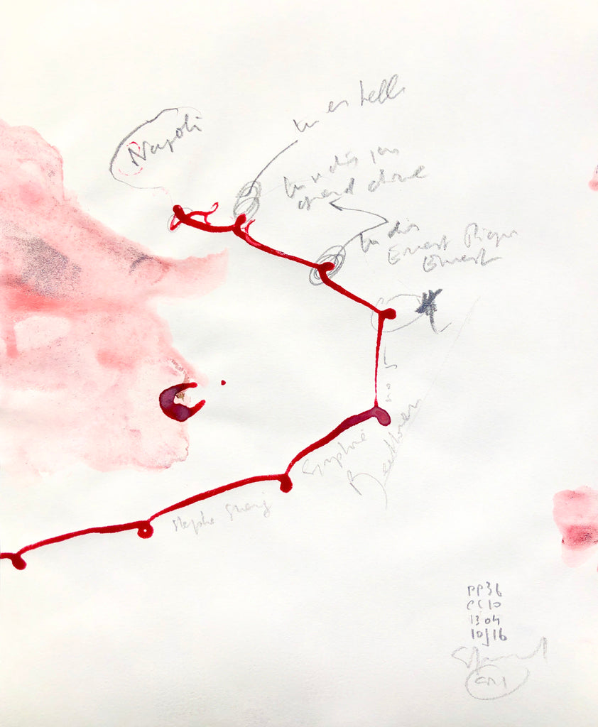 A large place is made in white on the paper to call the model’s skin and porcelain complexion. Red ink stains more or less diluted tending towards a controlled pink. Some discreet annotations with very fine lead, transcriptions of the oral exchanges between the painter and the model during the painting session...