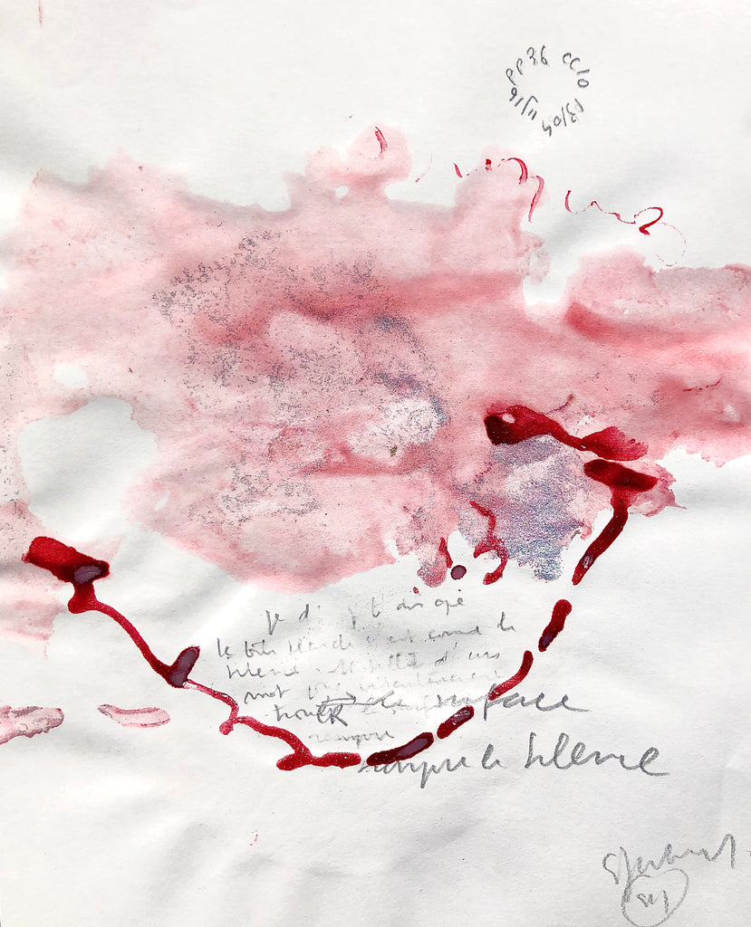 Red ink stains more or less diluted tending towards a controlled pink. Some discreet annotations with very fine lead, transcriptions of the oral exchanges between the painter and the model during the painting session...