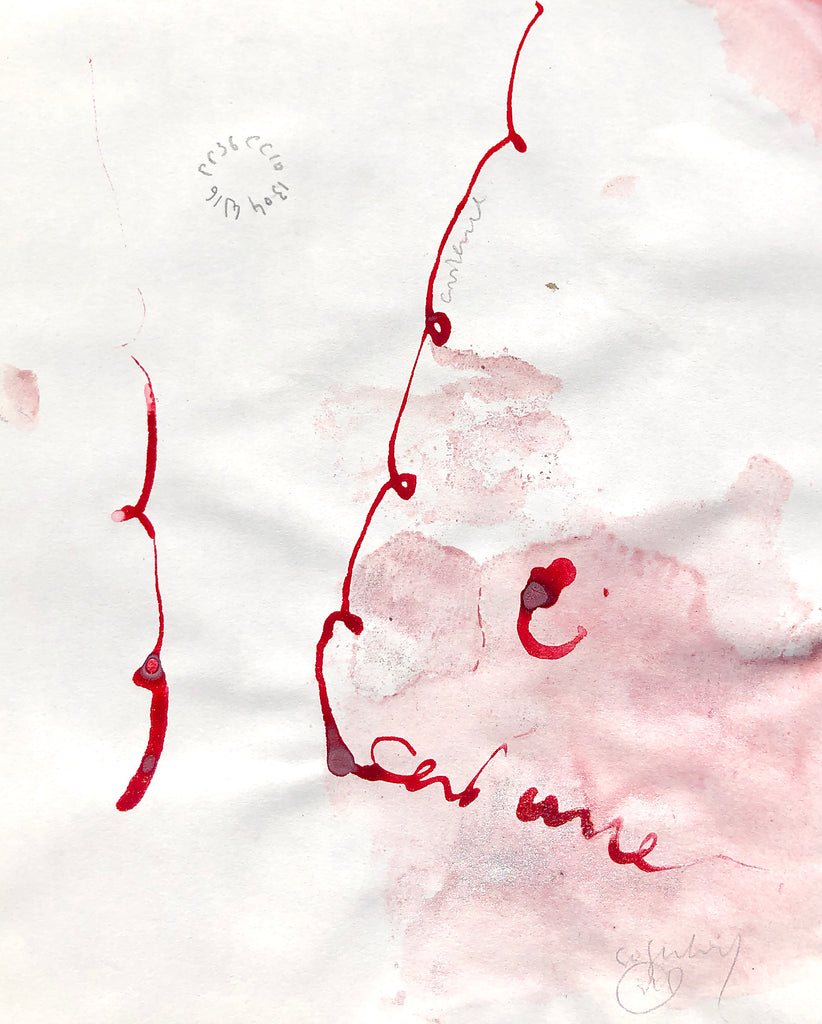 A large place is made in white on the paper to call the model’s skin and porcelain complexion. Red ink stains more or less diluted tending towards a controlled pink. Some discreet annotations with very fine lead, transcriptions of the oral exchanges between the painter and the model during the painting session. James writes the name of the model “Constance” in red ink, with a fine brush like musical notes that would escape from the space of the painting...