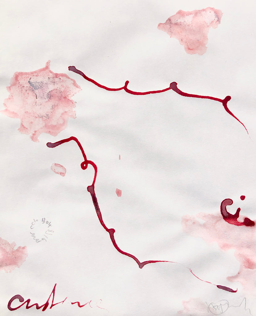A large place is made in white on the paper to call the model’s skin and porcelain complexion. Red ink stains more or less diluted tending towards a controlled pink. Some discreet annotations with very fine lead, transcriptions of the oral exchanges between the painter and the model during the painting session. James writes the name of the model “Constance” in red ink, with a fine brush like musical notes that would escape from the space of the painting...