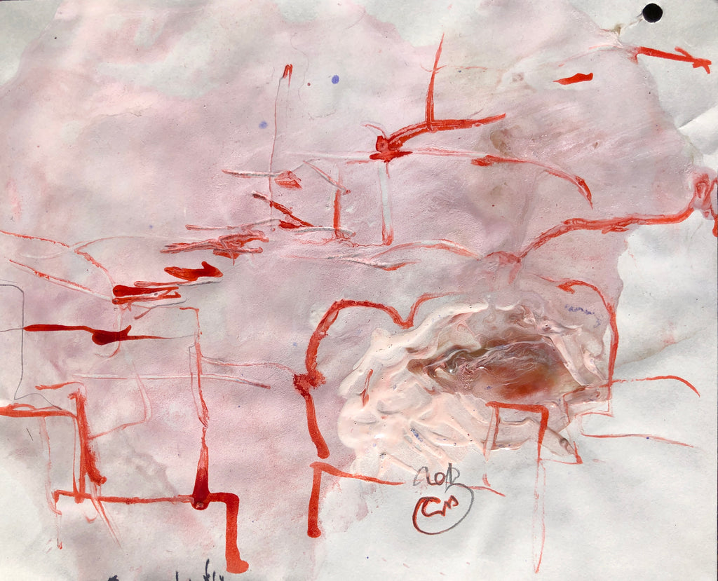 Mixed technique: colored pigments, glue, red orange ink on paper