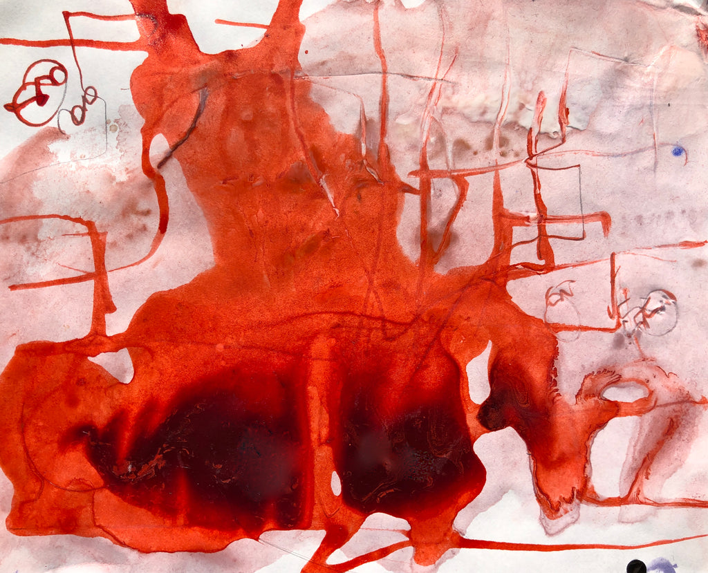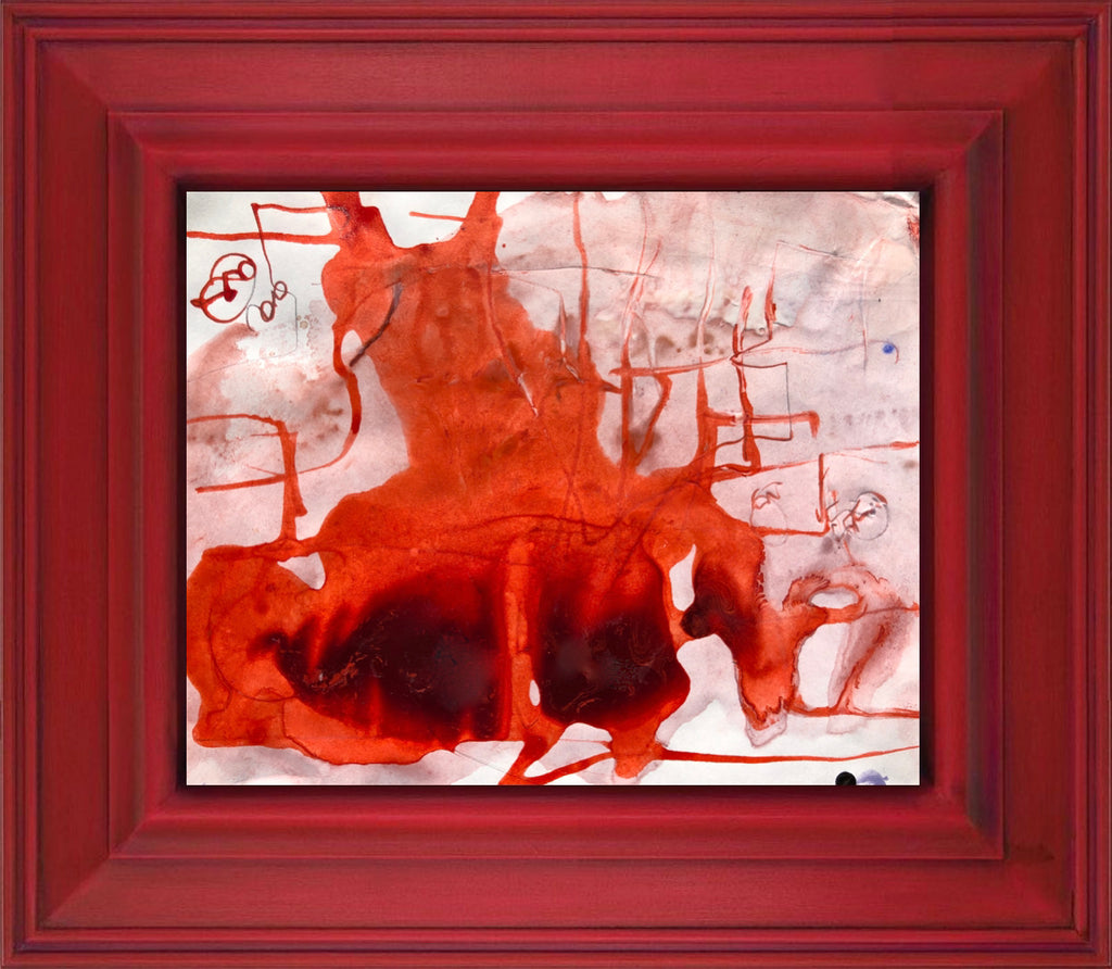 Mixed technique: colored pigments, glue, red orange ink on paper