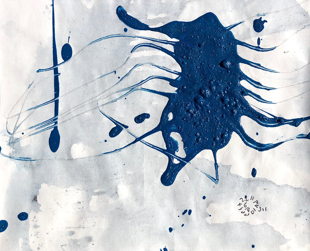 Mixed technique: colored pigments, glue, Blue ink on paper