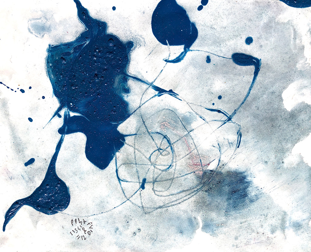 I always make Xsmall paintings on paper after the large size canvas « Presence painting ». I use the liquid paint left of the large canvas. It is a way of physically linking these two types of creations.This painting on paper is associated with the performance Presence painting n°47. James imagines a powerful and lush nature, visible in the accumulation of colors on the canvas. He imagines a territory where you can get lost... « Là, tout n’est qu’ordre et beauté » Charles Baudelaire