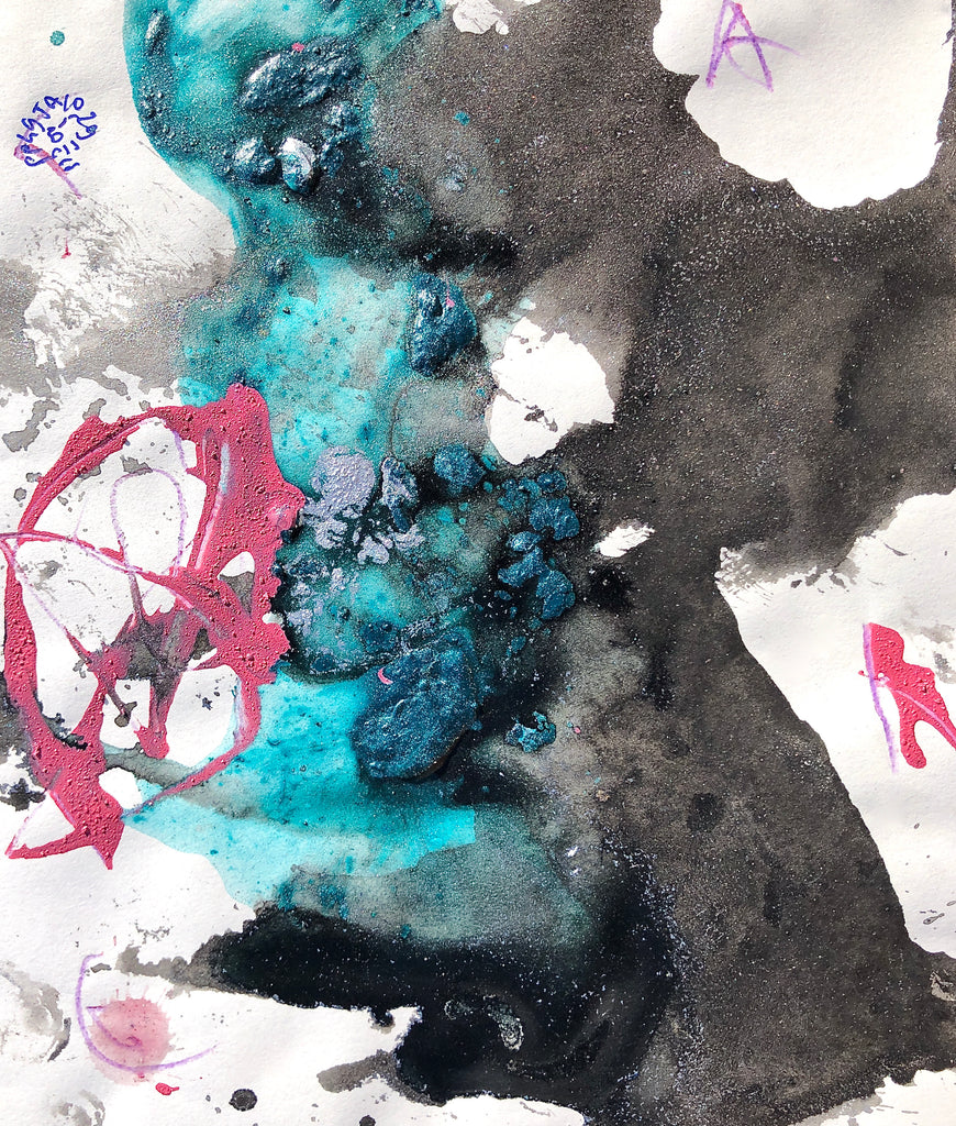 "I always make Xsmall paintings on paper after the large size canvas Presence painting*. I use the liquid paint left of this large canvas to make the drawings. It is a way of physically linking these two types of creations."