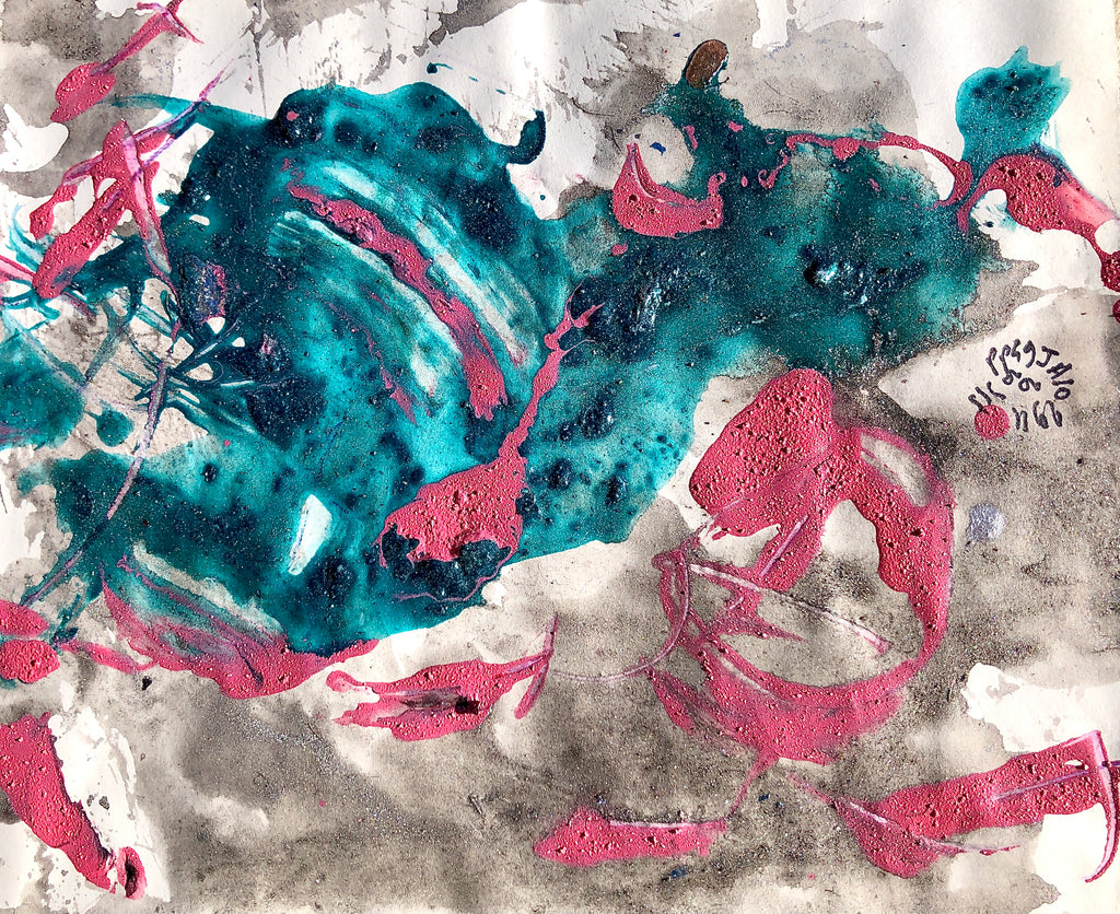 "I always make Xsmall paintings on paper after the large size canvas Presence painting*. I use the liquid paint left of this large canvas to make the drawings. It is a way of physically linking these two types of creations."