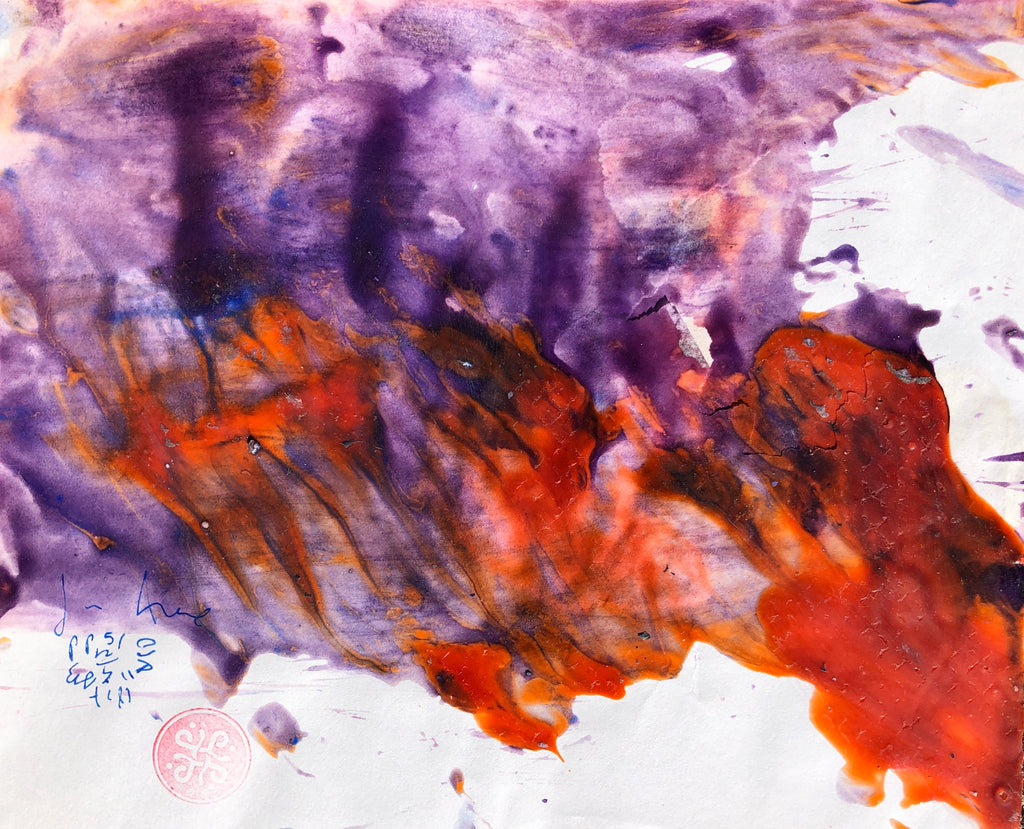 PP51 XS4 ( Endommagé) This XS painting on paper reflects the mix technique of James with both solid and liquid elements. A very contrasted palette of purples and oranges playing with the white surface of the paper.
